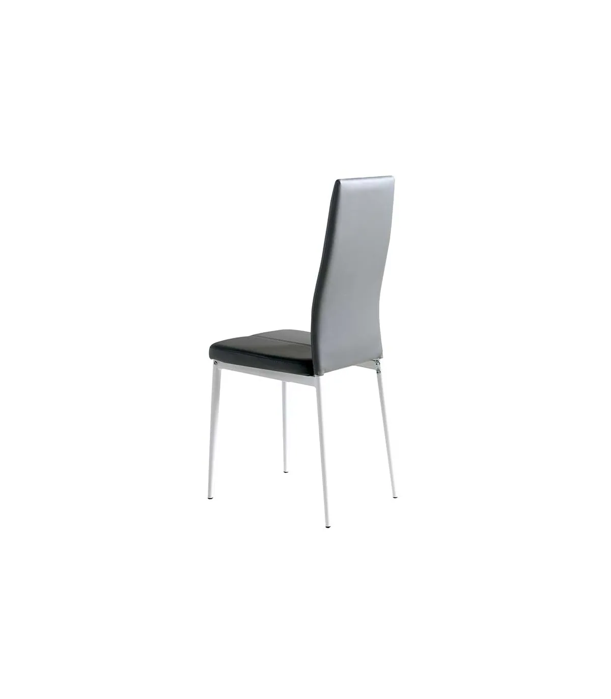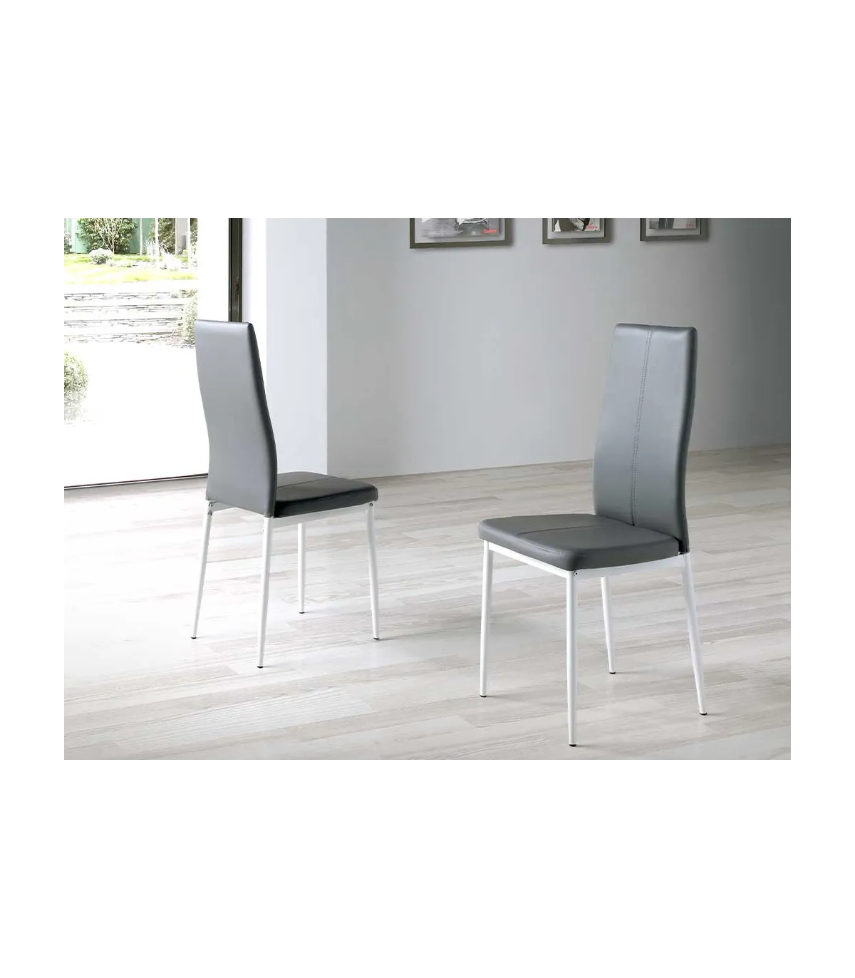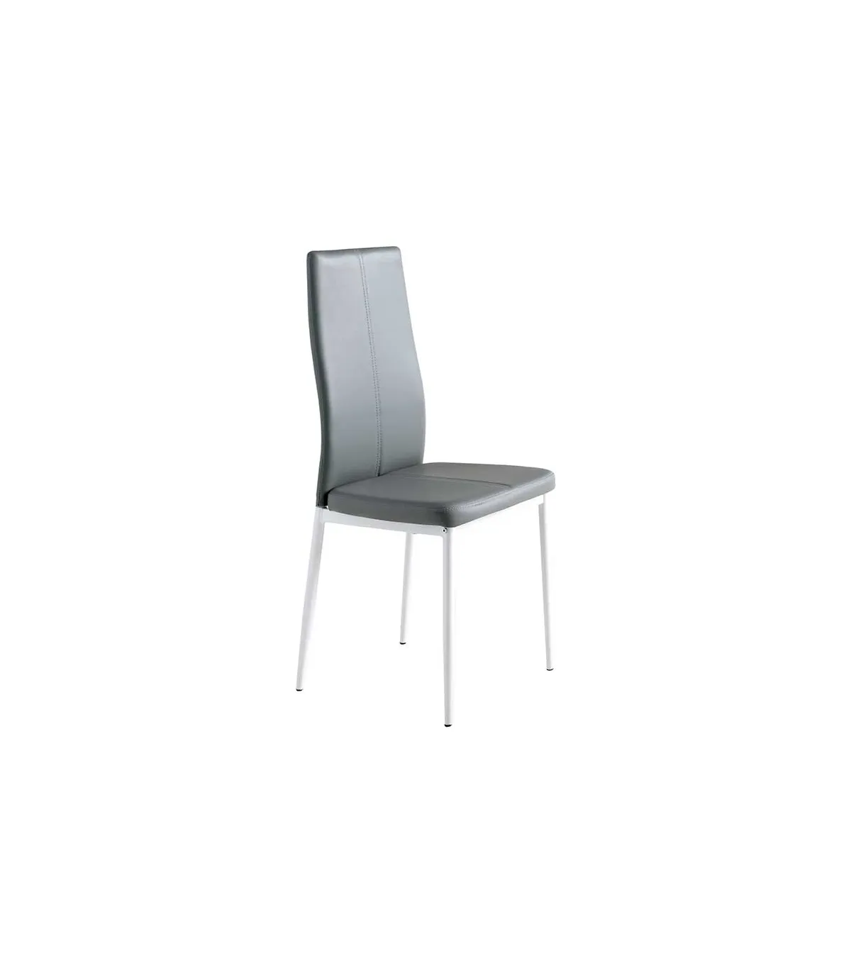 Pack de 4 sillas de comedor tapizadas en polipiel gris. Su estructura es metálica y está lacada en blanco.