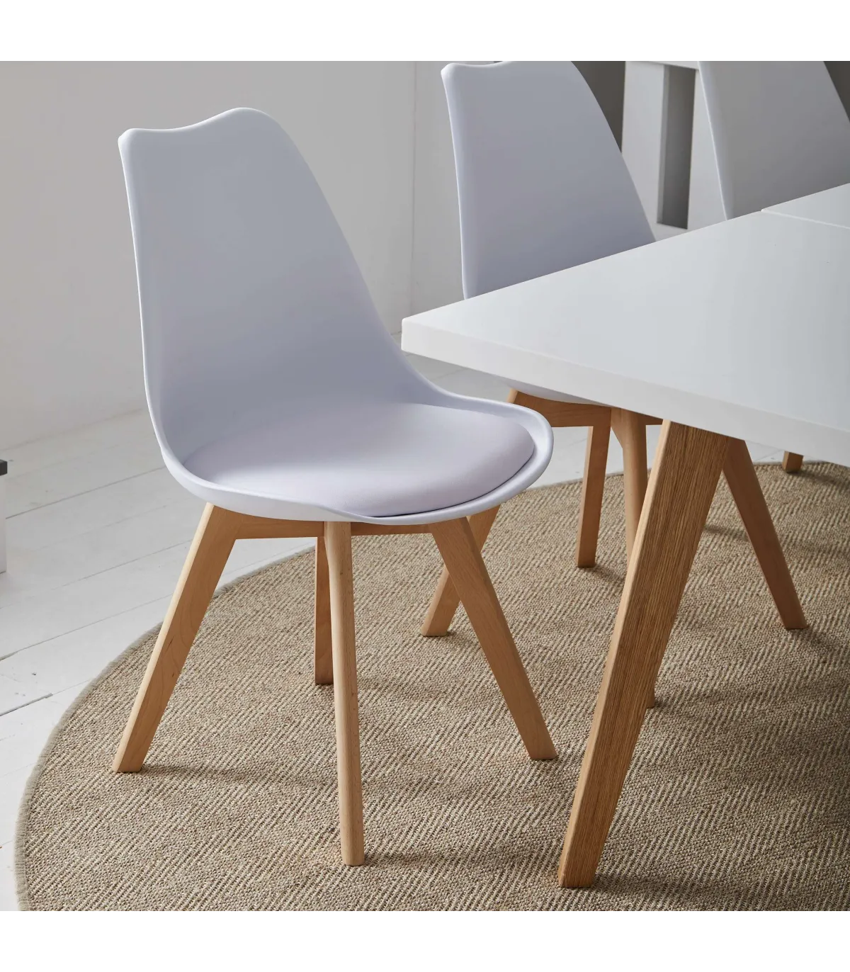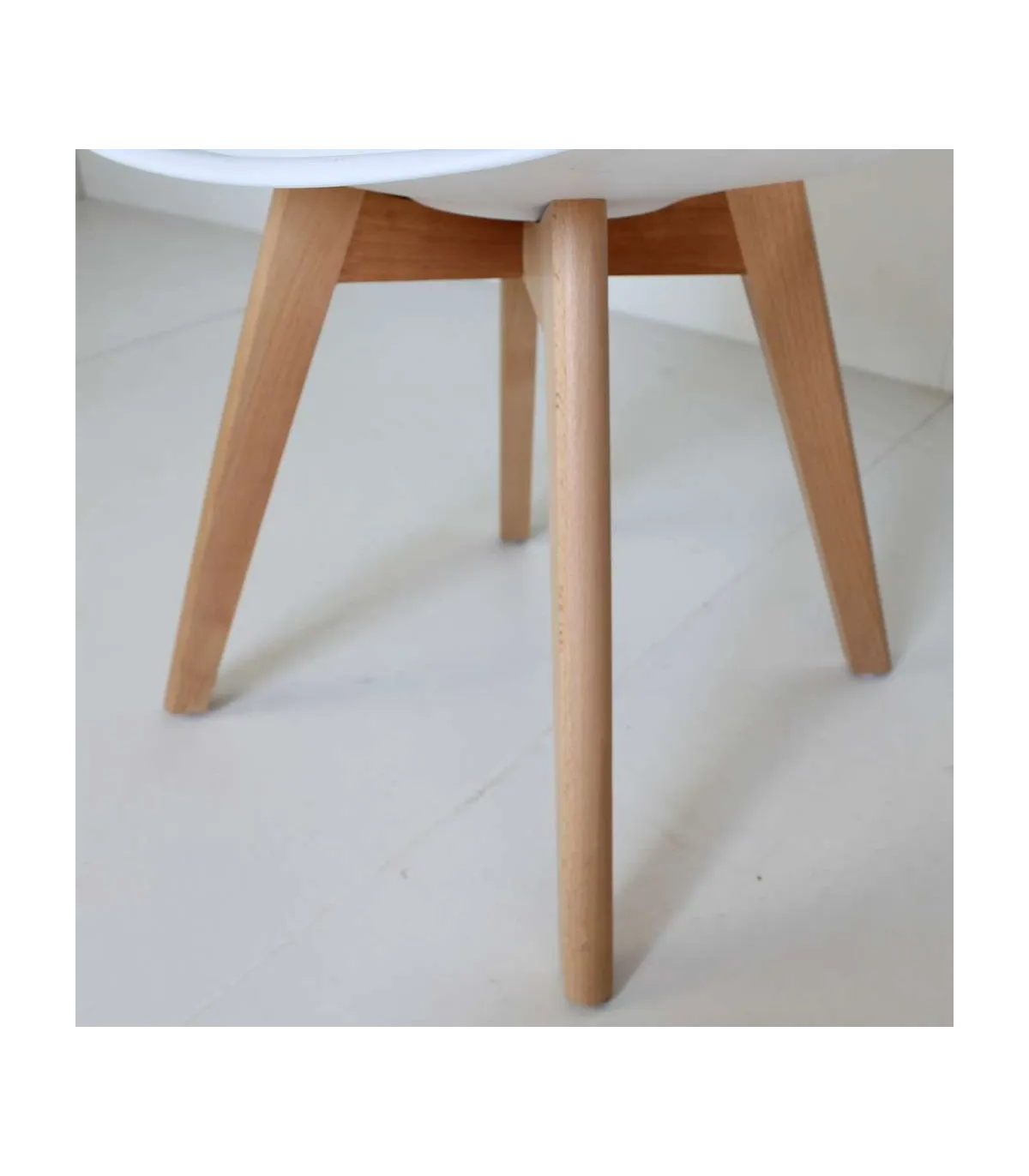 La combinación de las patas en madera de haya con el asiento en polipropileno blanco crea un contraste visual atractivo y armonioso. Esta mezcla de materiales y colores agrega un toque moderno y versátil a las sillas, lo que las convierte en una opción ideal para integrarse en diferentes estilos decorativos.