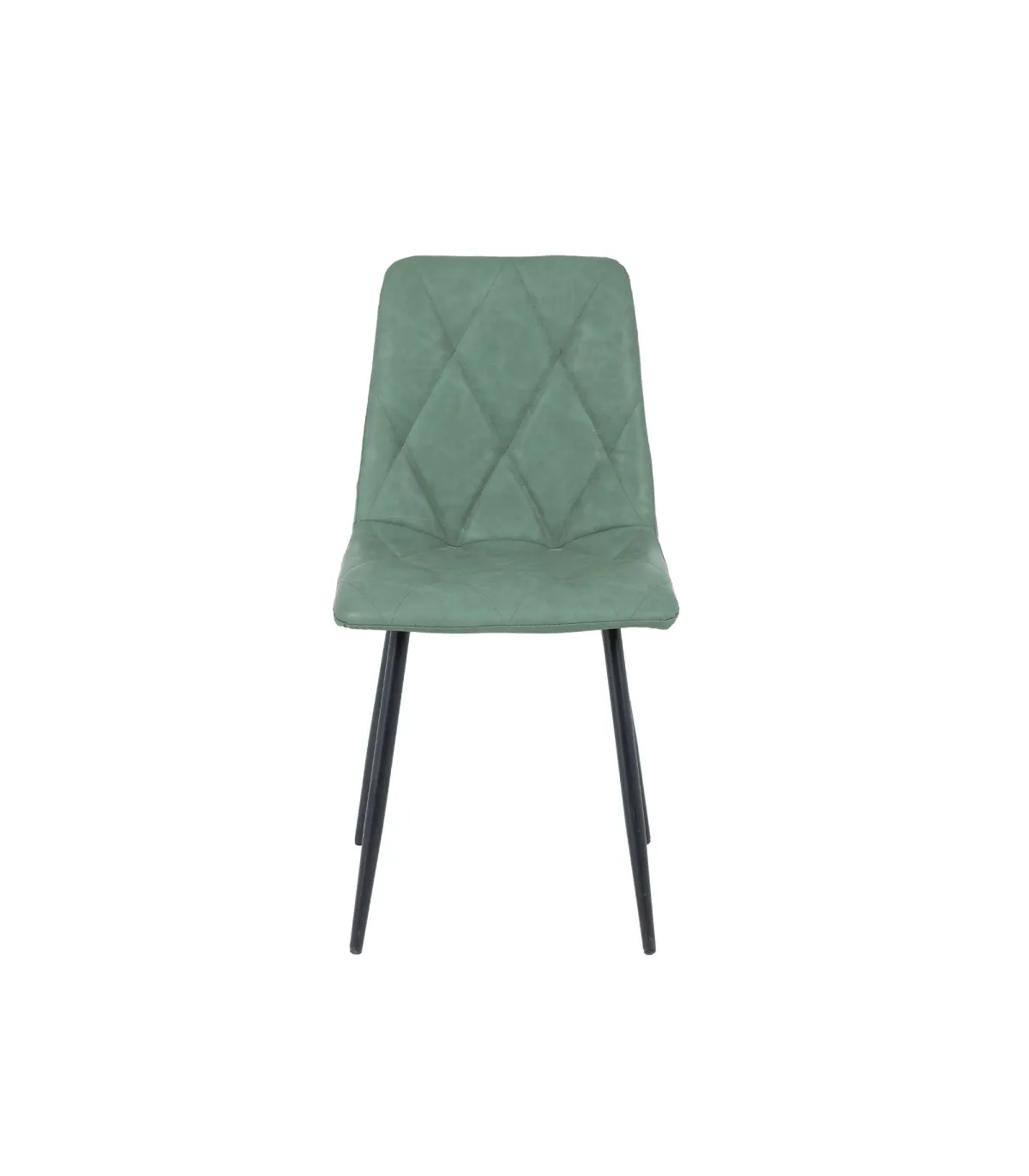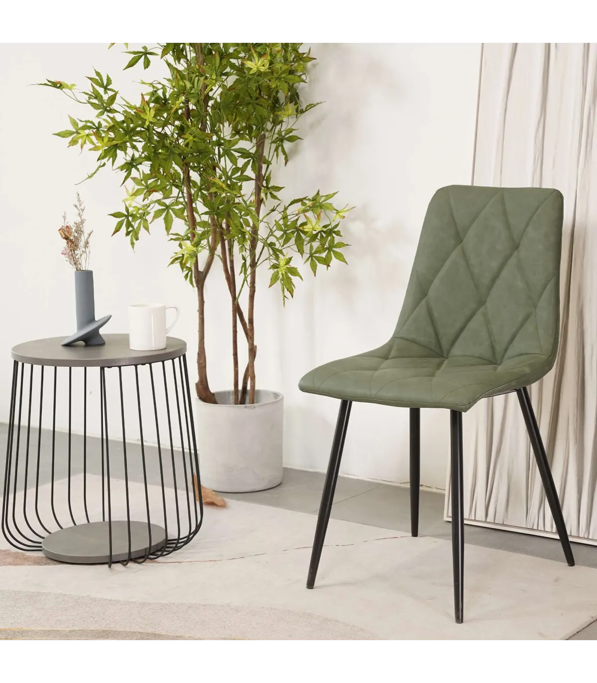 Estas bonitas Sillas de Salón de estilo moderno podrás ponerlas en cualquier comedor o salón y quedarán perfectas. Tapizado en polipiel verde, acolchado con rombos grades, pata metal negro mate.