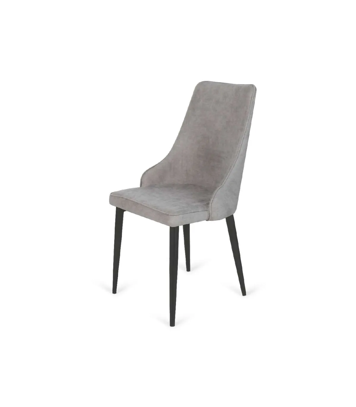 La silla tapizada en tela tipo Lido gris claro con ribete en todo el perímetro y patas de metal color negro es una opción refinada y contemporánea para complementar cualquier espacio interior. Aquí tienes una descripción detallada: