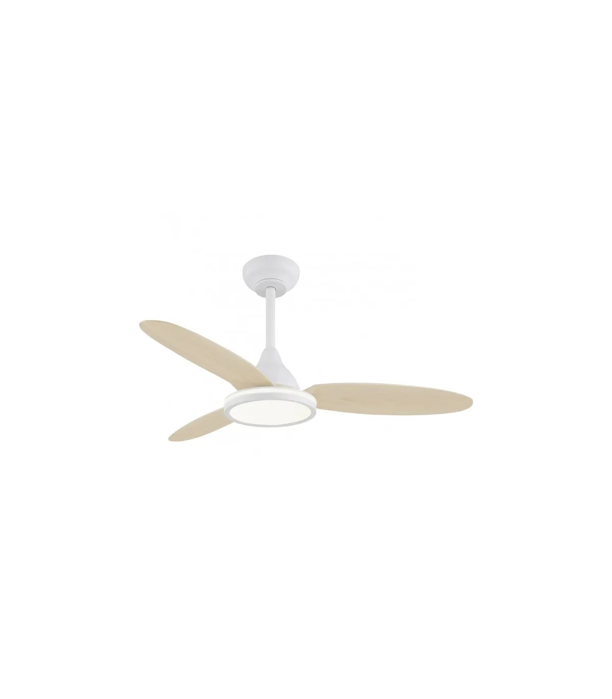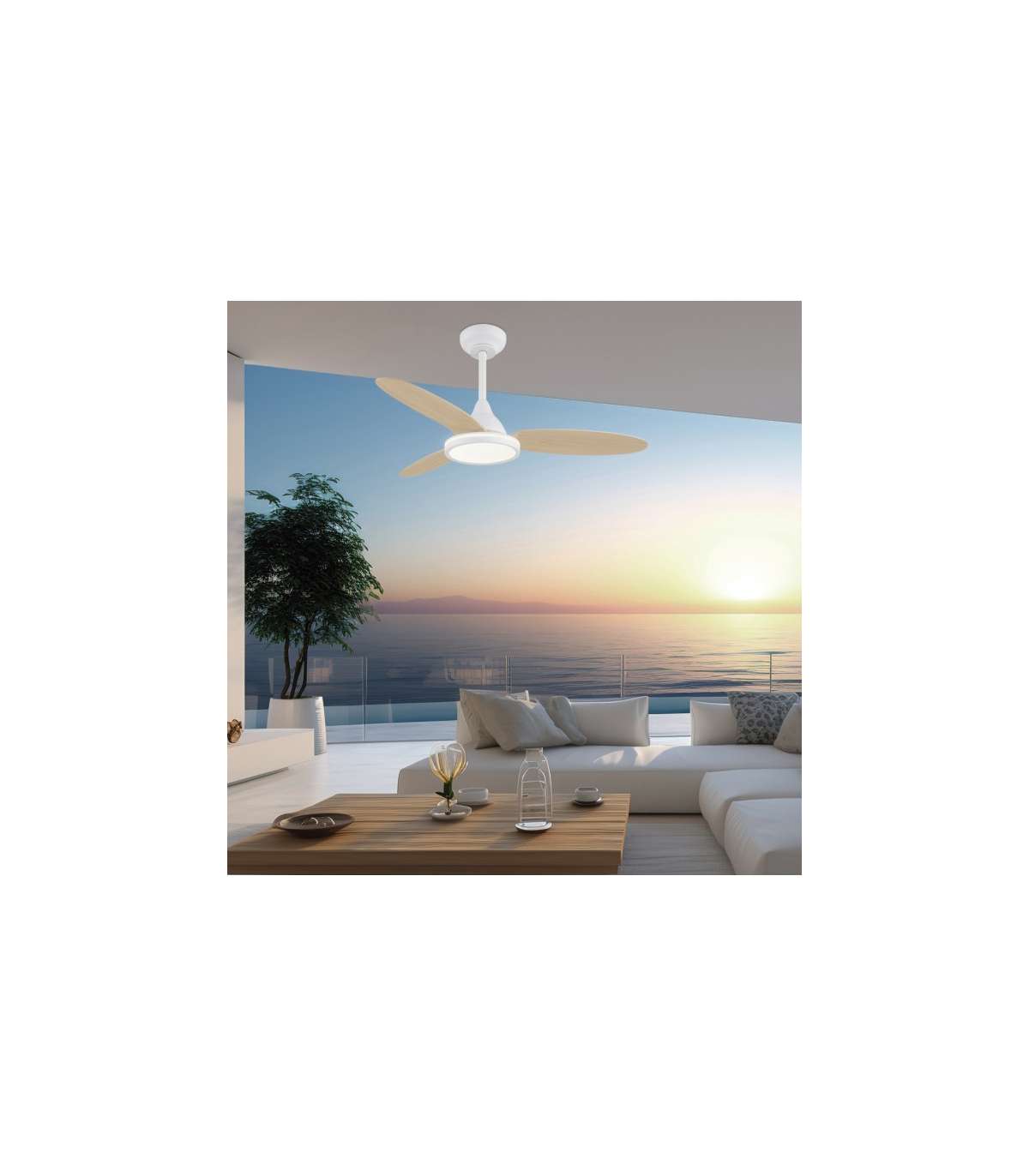 Disfruta de un ambiente fresco y elegante con el ventilador Mahon · 3 palas · acabado blanco/madera · ideal para cualquier espacio.