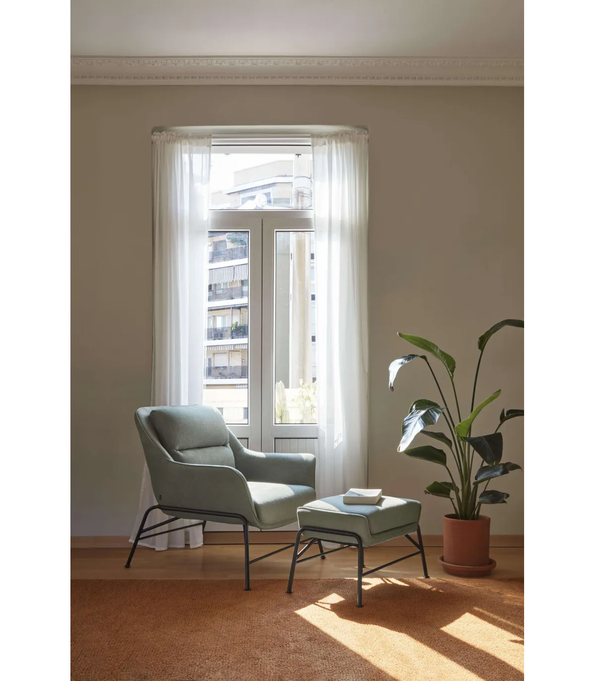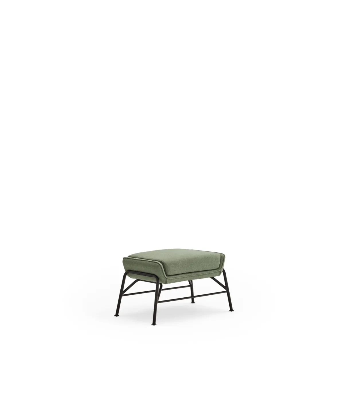 Puff modelo Sadira Tapizado en tela color gris verdoso. Las patas son metálicas de una sola pieza, solo disponibles en negro.