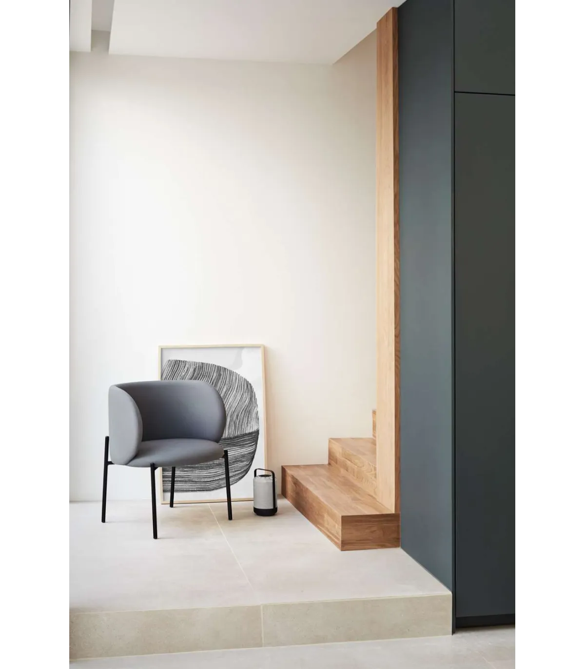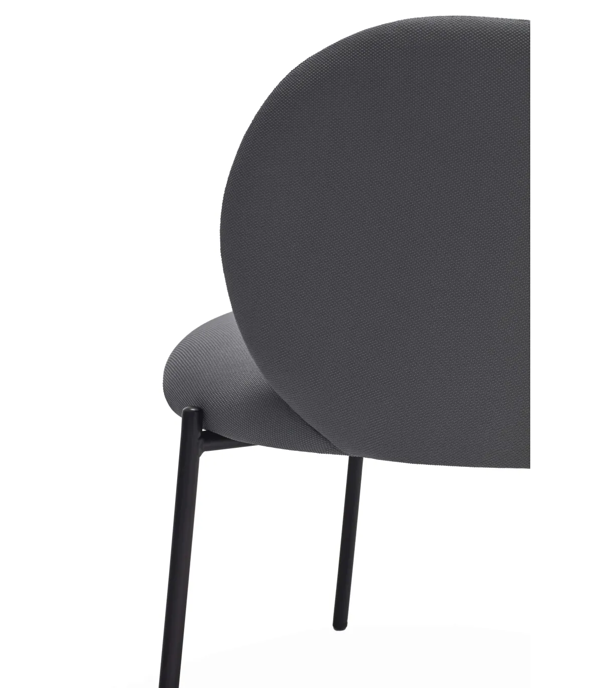 Butaca modelo Mogi. Tapizado en tela color gris oscuro. Las patas, que recubren todo el asiento, son metálicas de una sola pieza en negro.