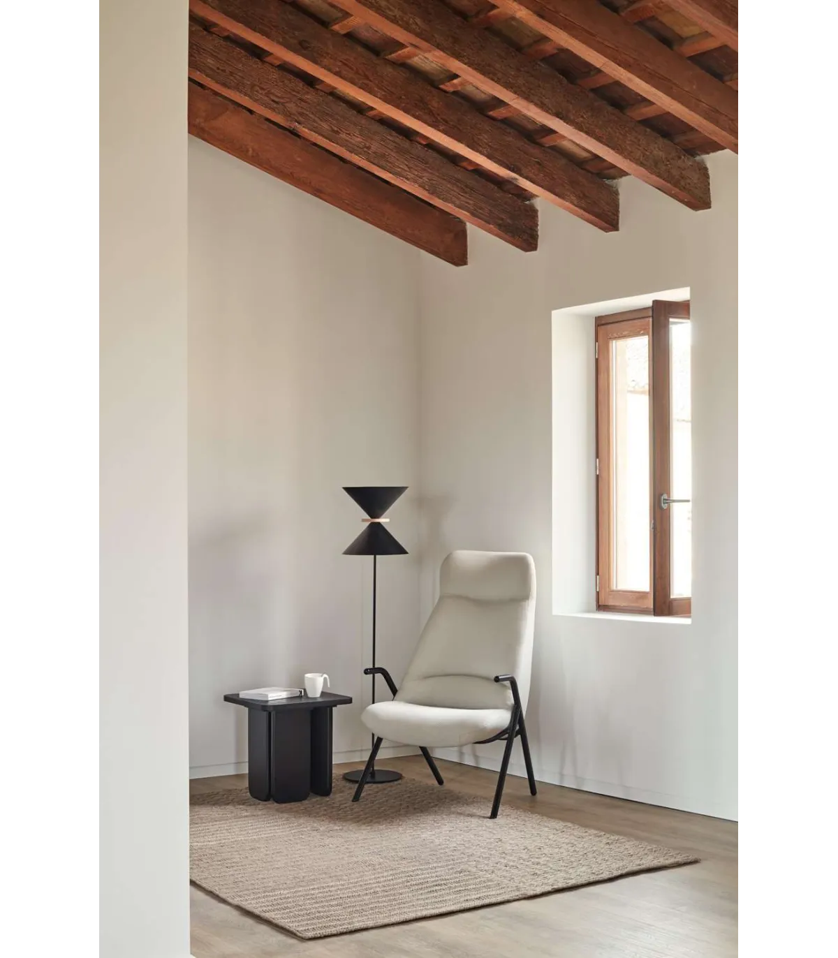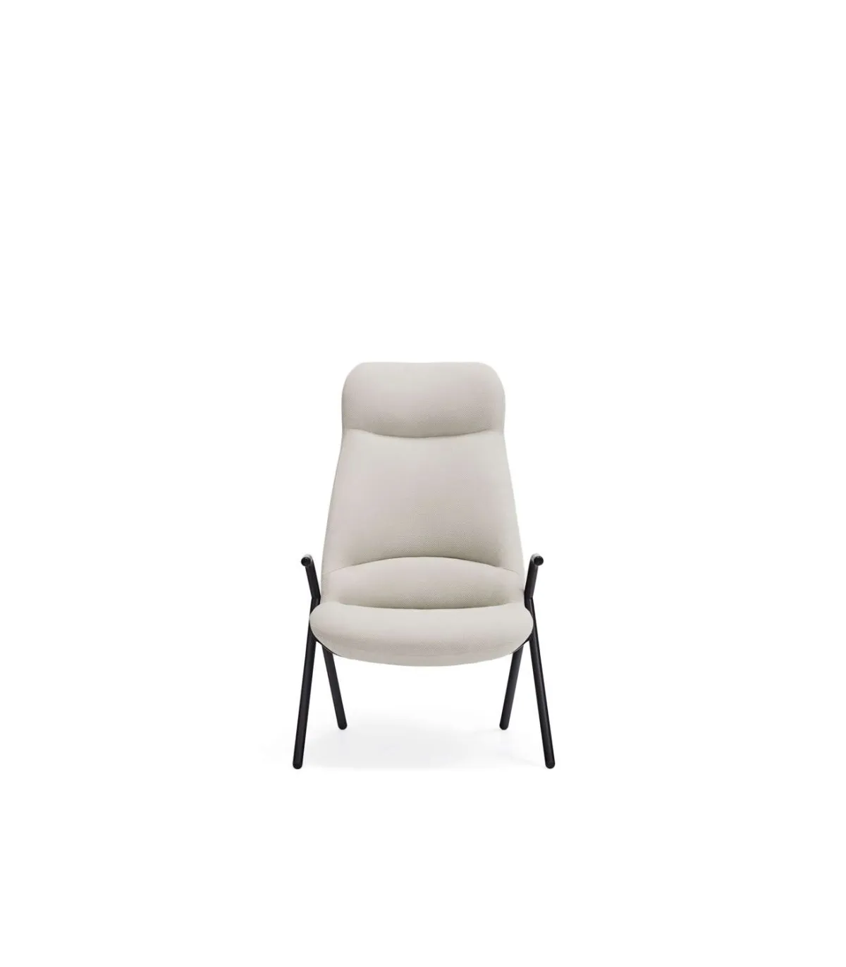 Butaca modelo Dins-Alta. Tapizado en tela color crema. Las patas, que recubren todo el asiento, son metálicas de una sola pieza en negro.