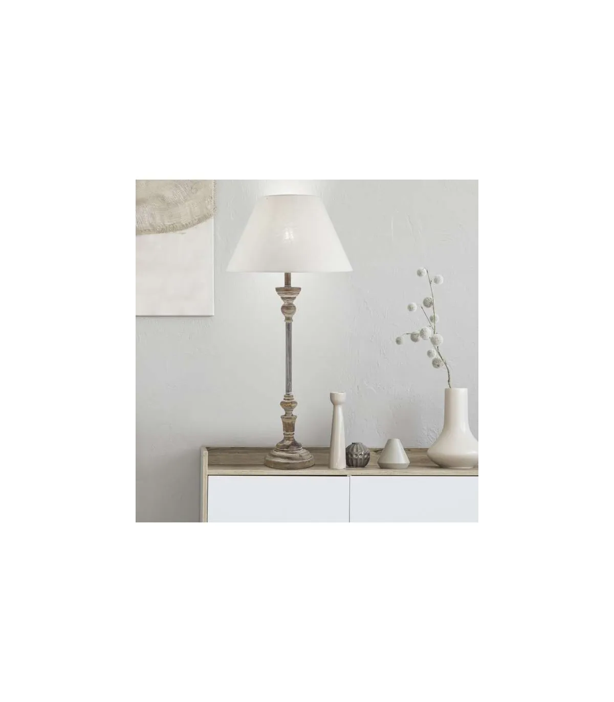 Lámpara de sobremesa para salón o dormitorio modelo Laseu, realizada en metal con pie en madera acabado envejecido y pantalla lino beig.
