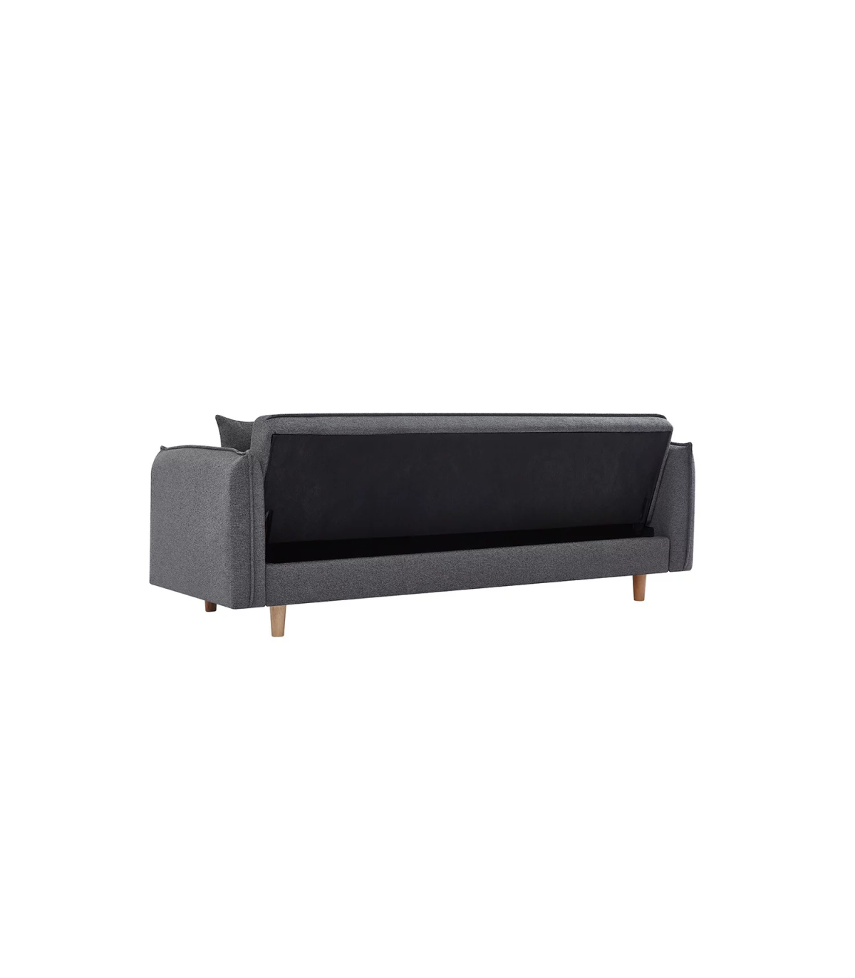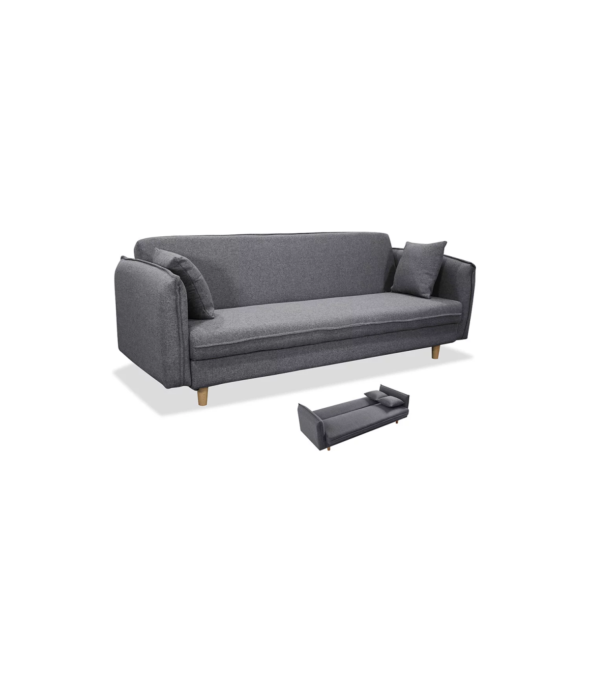 Sofá cama 3 plazas tapizado en textil color gris de diseño nordico, funcional y comodo. Con un mecanismo de apertura fácil, se transforma en una cama perfecta para espacios pequeños. Incluyen un arcón de almacenamiento integrado debajo del asiento. Fabricado en tejido de 100% poliéster en color gris.