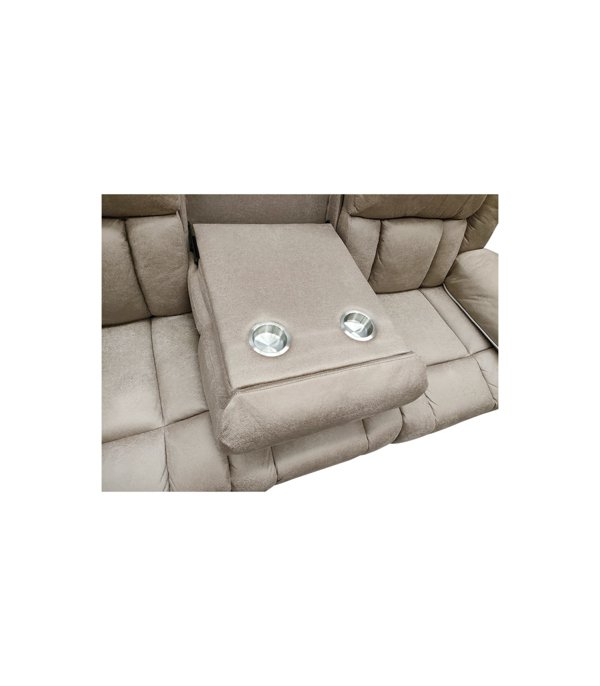 Sofá tres plazas con dos asientos de relax con palanca manual en color beige. Con respaldo central abatible con portavasos, comodidad y confort al alcance de tu mano. Este sofá relax es perfecto para relajarse y disfrutar del tiempo libre.