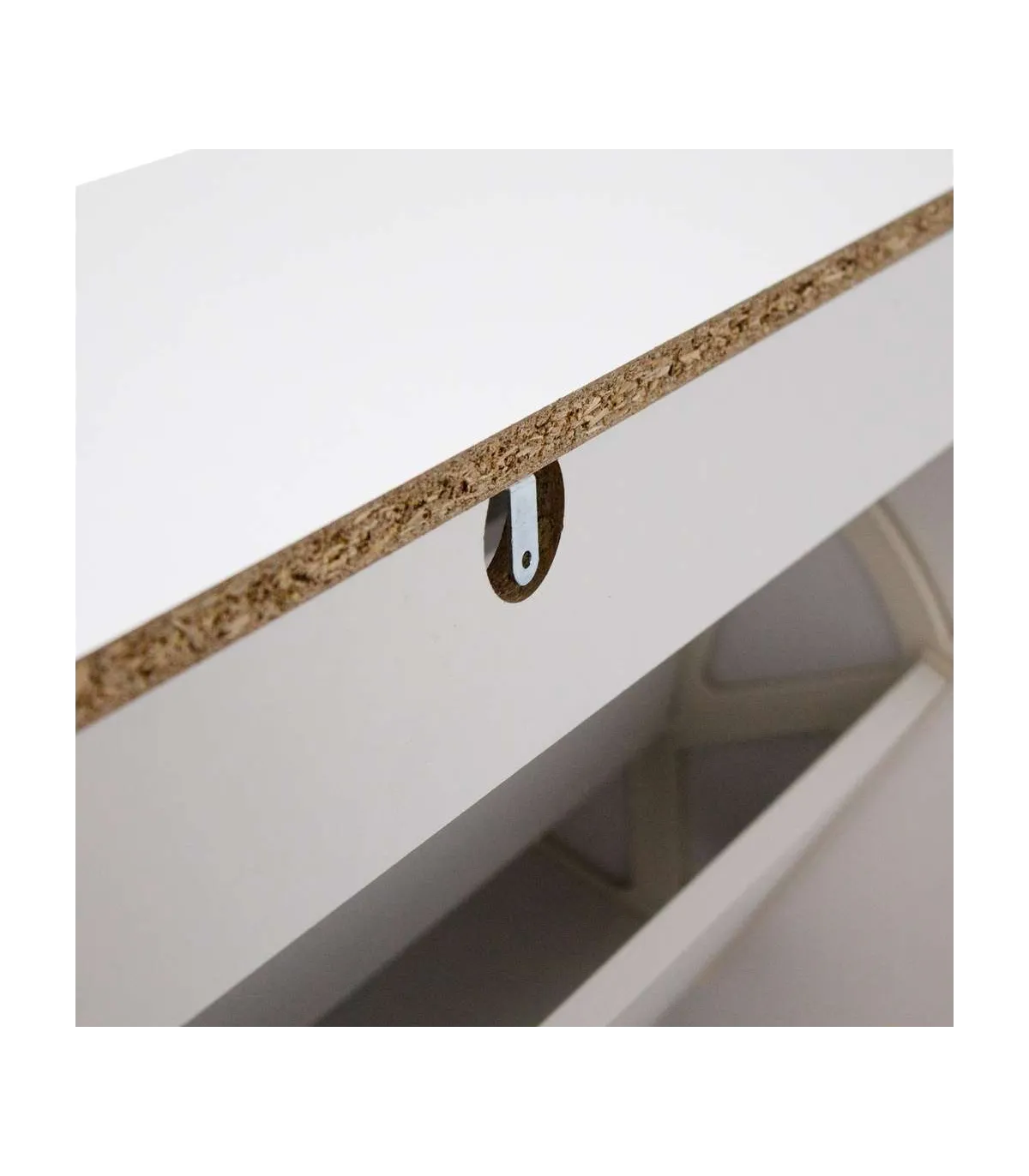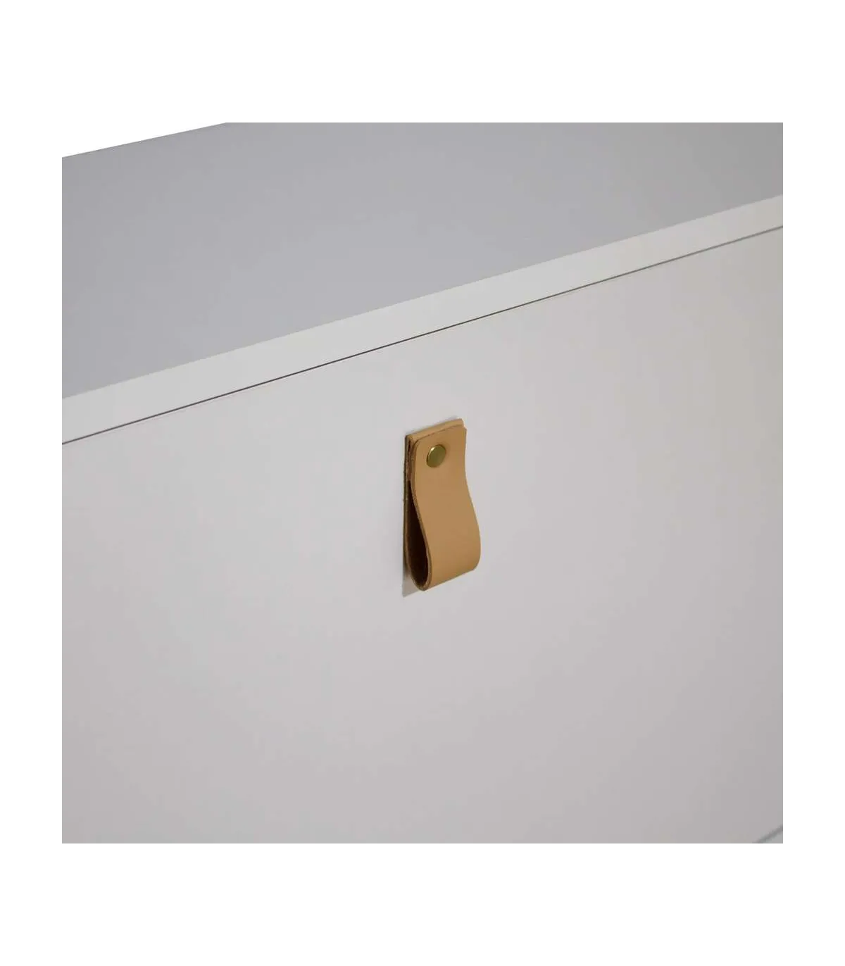 Los materiales utilizados en su construcción incluyen tablero de aglomerado melaminizado de 15 mm, lo que garantiza su resistencia y durabilidad. Los tiradores están elaborados en simil piel PU (poliuretano), añadiendo un toque de sofisticación al diseño. Las patas, hechas de madera de pino y barnizadas con un tono natural, proporcionan una base sólida y elegante.