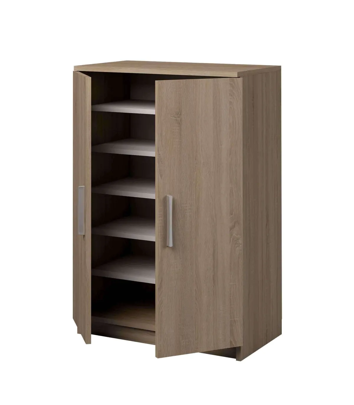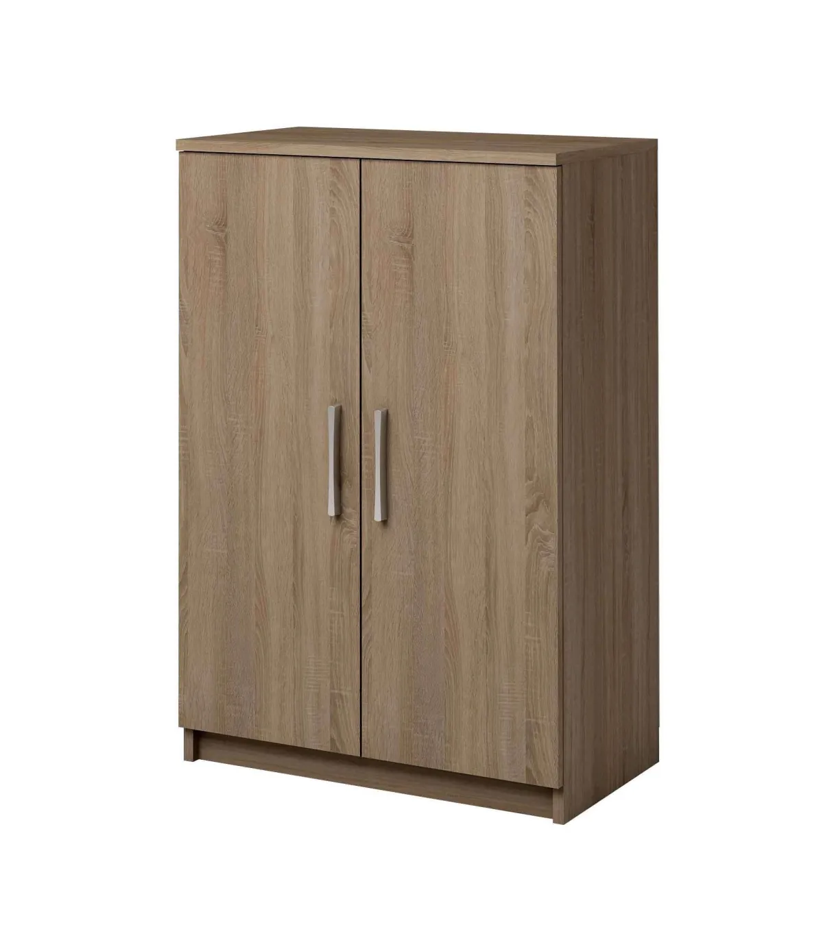 Funcional armario multiusos bajo en color roble cortez con dos puertas y 5 baldas móviles que te proporcionarán gran capacidad para poder almacenar todo lo que no quieras que esté a la vista.