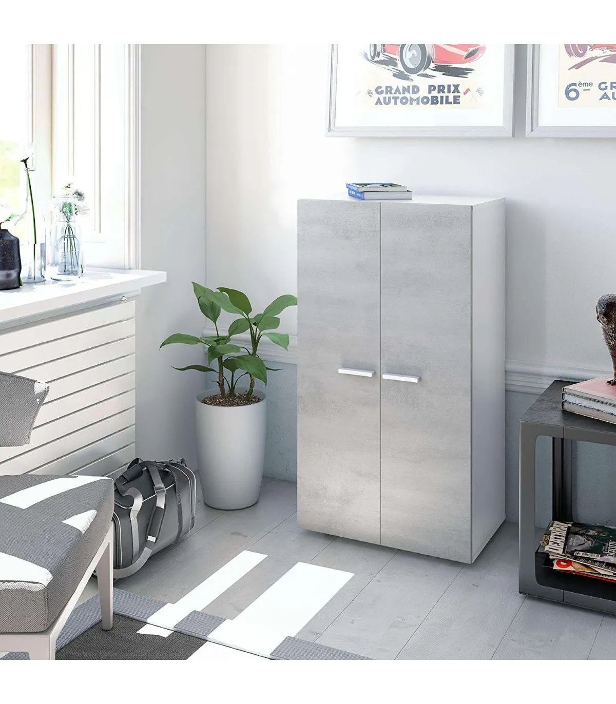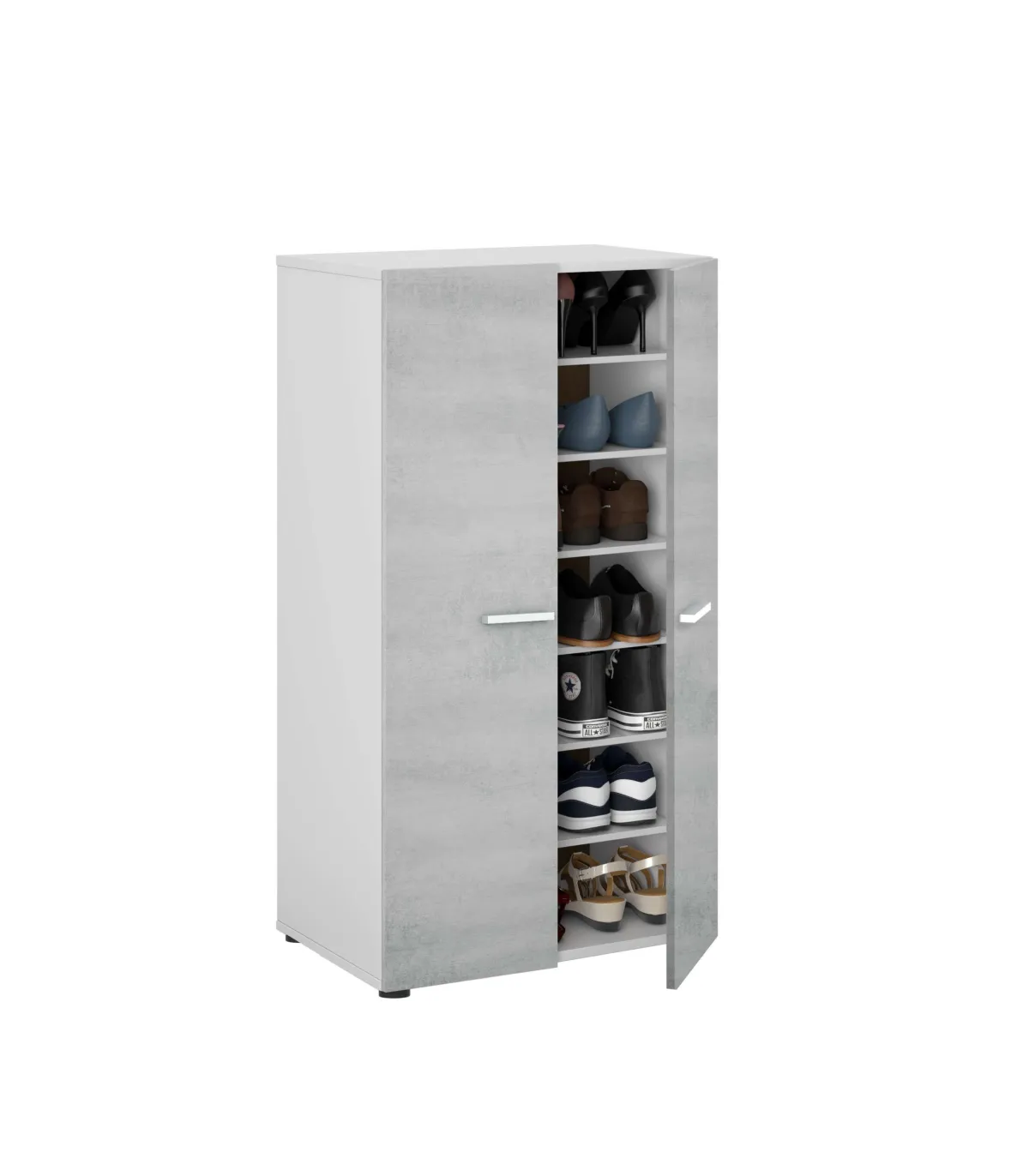 Zapatero 2 Puertas con acabado en Color Blanco Brillo y Cemento, Medidas: 103 cm (Alto) x 55 cm (Ancho) x 36 cm (Fondo)