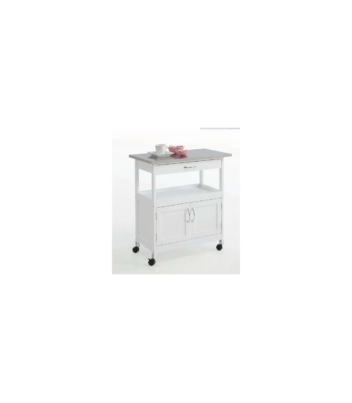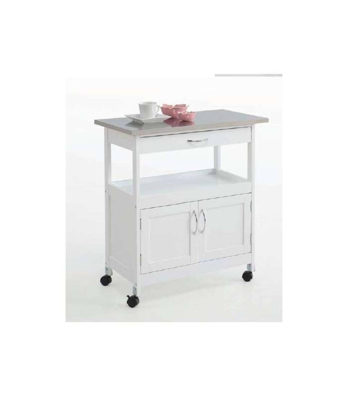C'est le complément idéal de votre cuisine. Ce magnifique chariot de cuisine en blanc avec un plateau en cerisier ou en gris dispose d'un tiroir et de deux portes, il est également équipé de roulettes pour que vous puissiez le déplacer d'un endroit à l'autre.