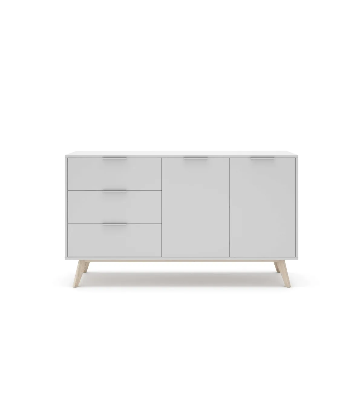 Aparador Campus de estilo nordico realizado en madera de pino lacado en color blanco/blanco cera, con tres cajones con guías metálicas de apertura y dos puertas batientes con balda interior.
