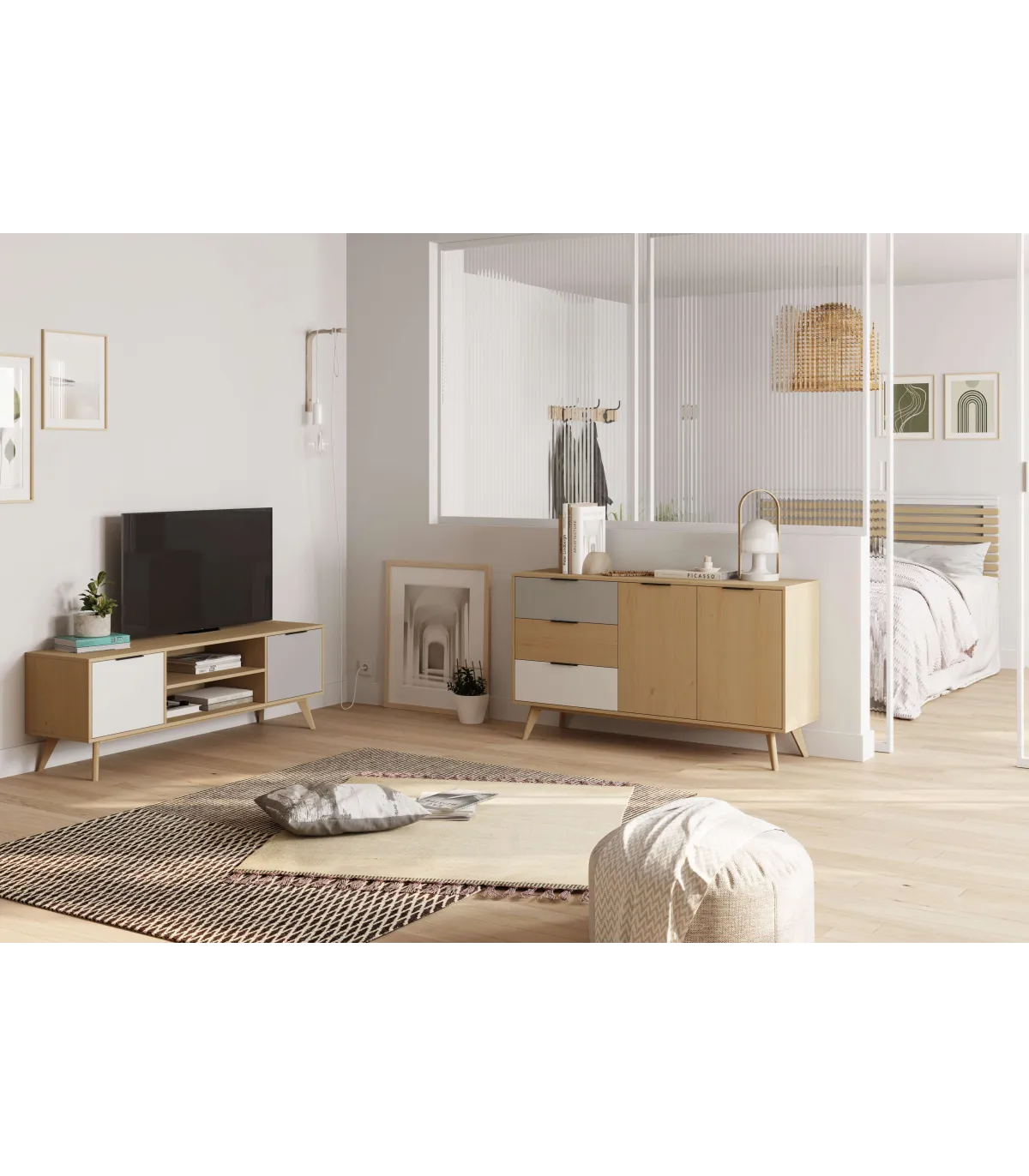 Aparador Elfa de estilo nordico realizado en madera de pino en color roble combinado con gris claro y blanco, con tres cajones con guías metálicas de apertura y dos puertas con balda interior.