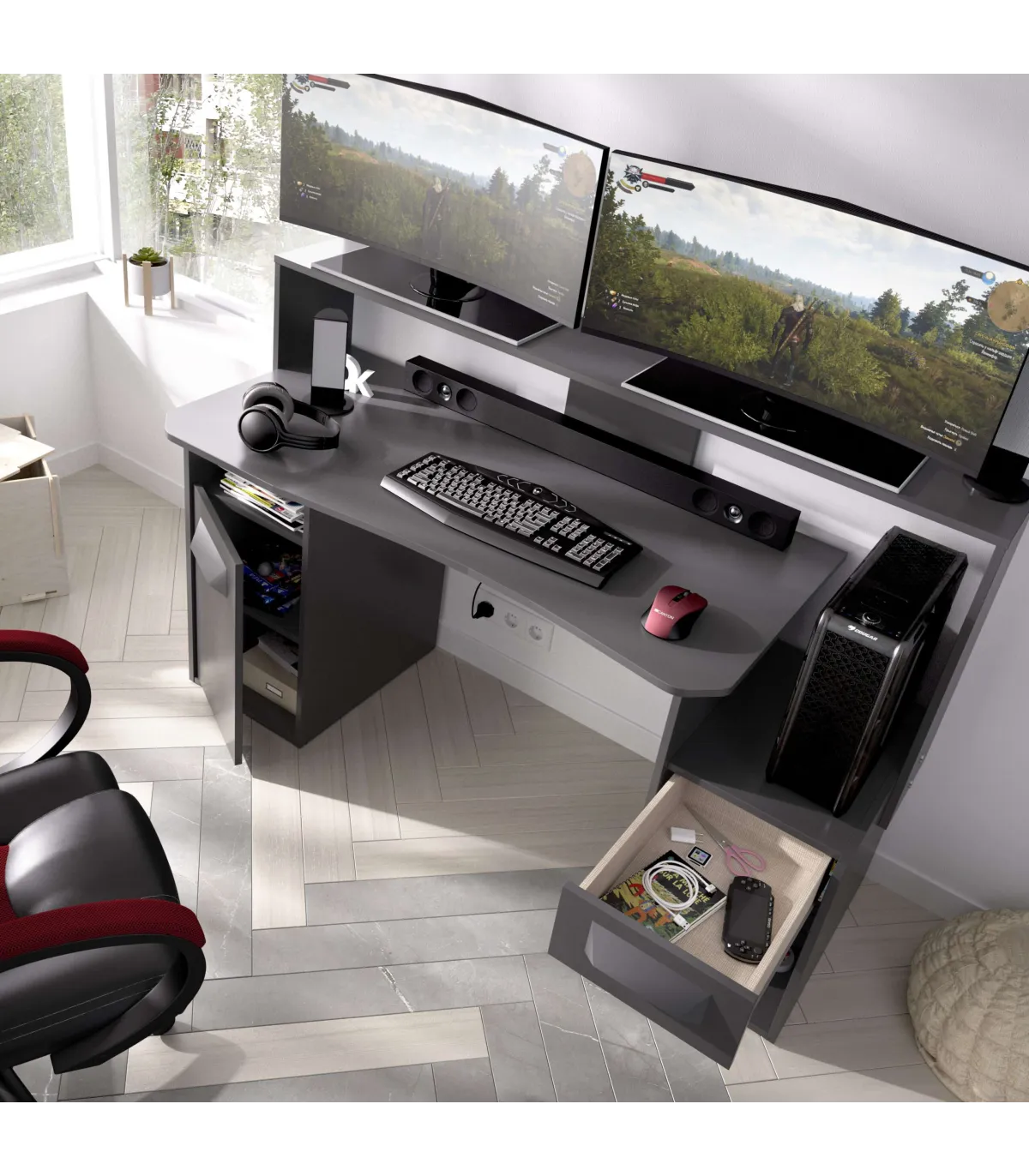 Mesa de escritorio gaming en color grafito con un fabuloso diseño. Se compone de un cajón, una puerta y varios huecos para que puedas almacenar lo que desees. El color grafito lucirá ideal y es sencillo de combinar.