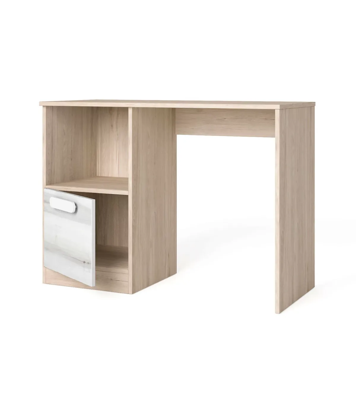 Bureau naturel/blanc avec un tiroir et deux ouvertures sur un côté.