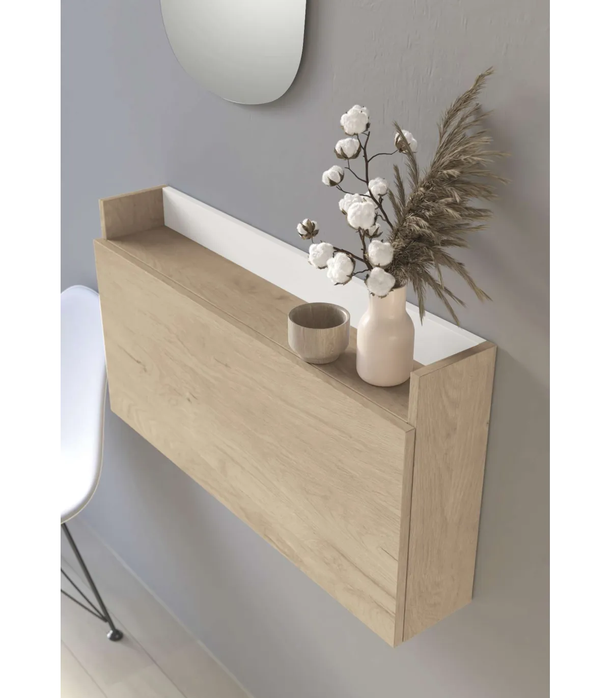 Escritorio para colgar, funcional de líneas sencillas y fluidas en melamina con el respaldo en otro color a contraste y una puerta abatible con 2 cilindros de apertura lenta para evitar golpes.