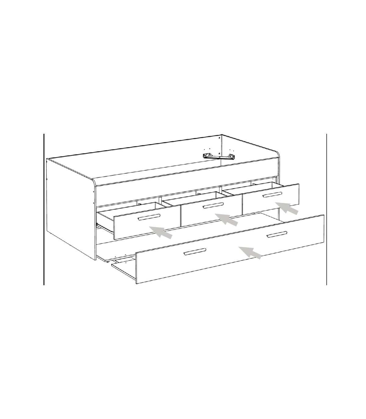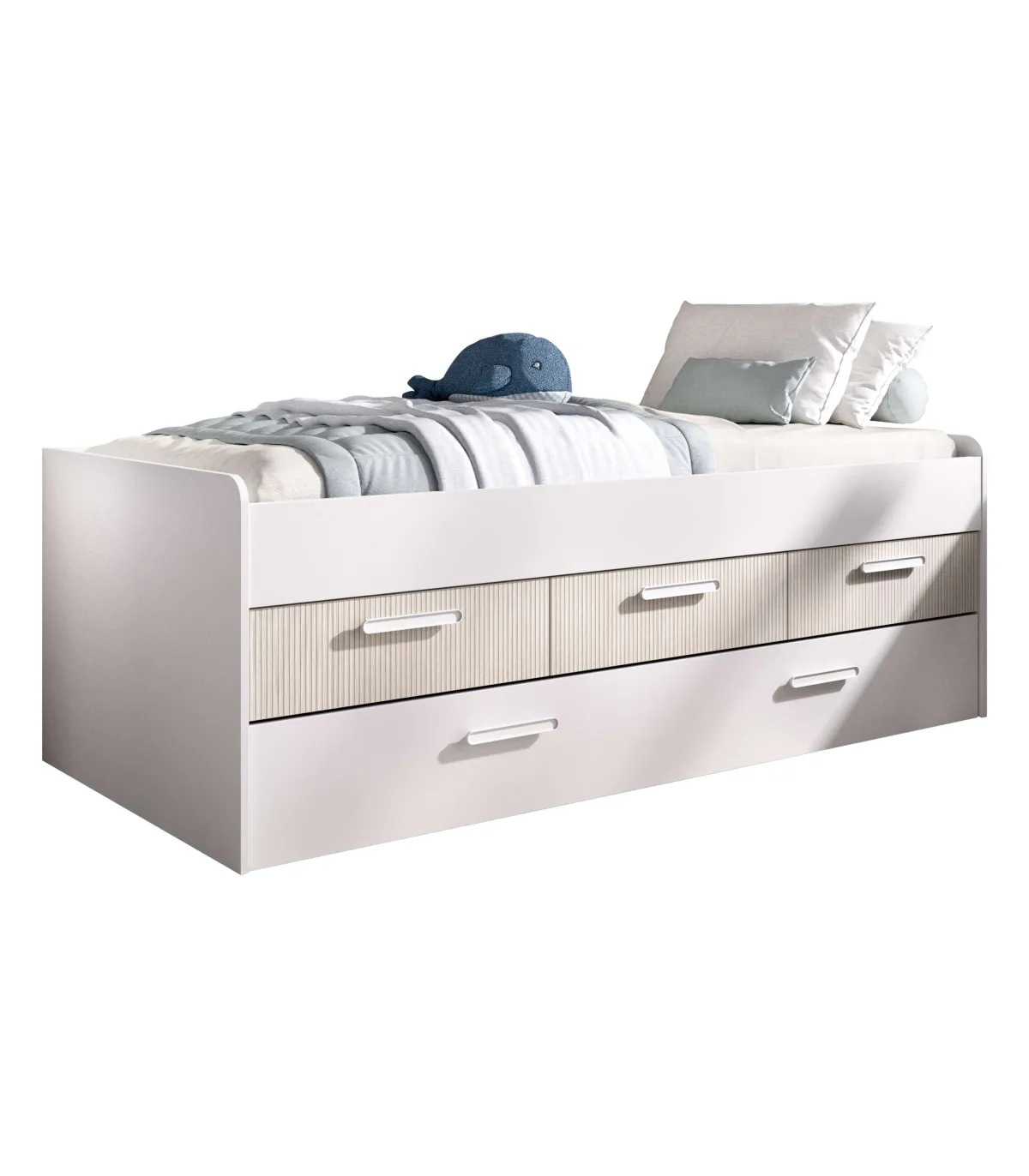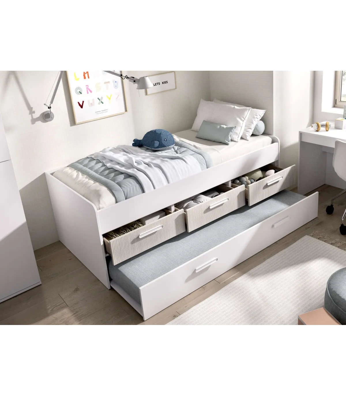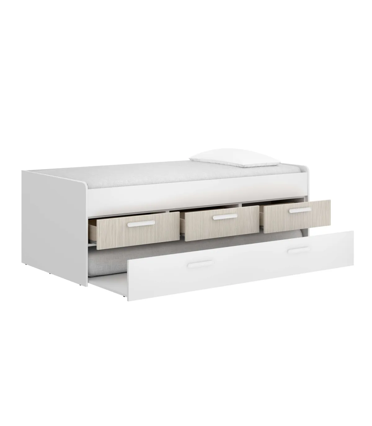 Ensemble compact de lits gigognes. Comprend un tiroir pour le rangement en dessous et une belle étagère.