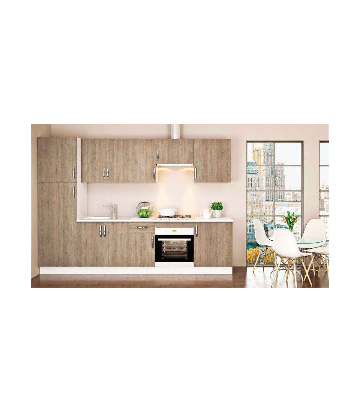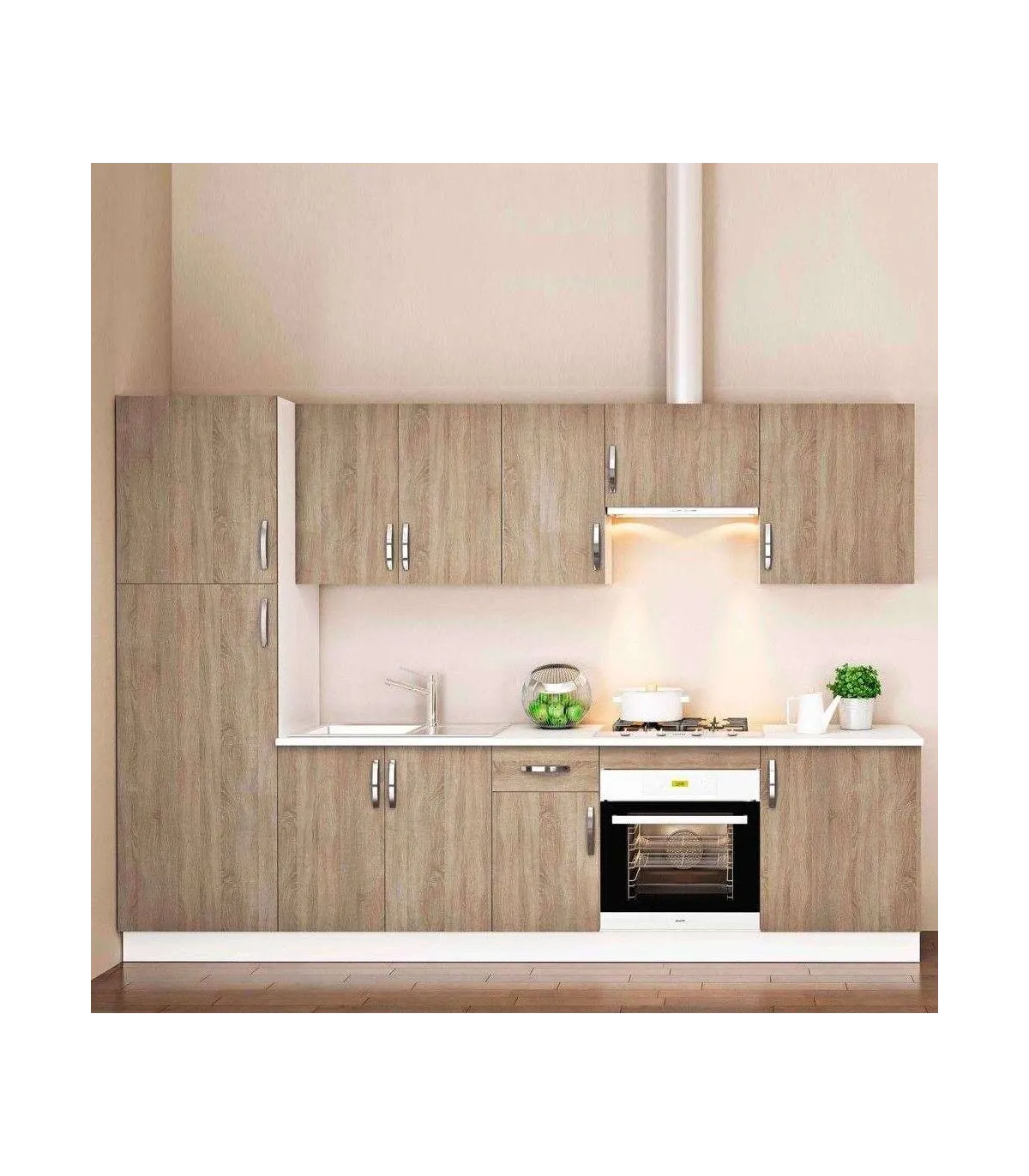 Cuisine complète de 3 mètres en couleur chêne avec un beau design et à un prix incroyable.