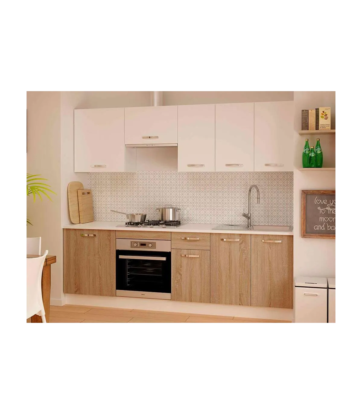 Cuisine complète avec des éléments bas de couleur chêne et des éléments muraux blancs, avec un beau design et à un prix incroyable.