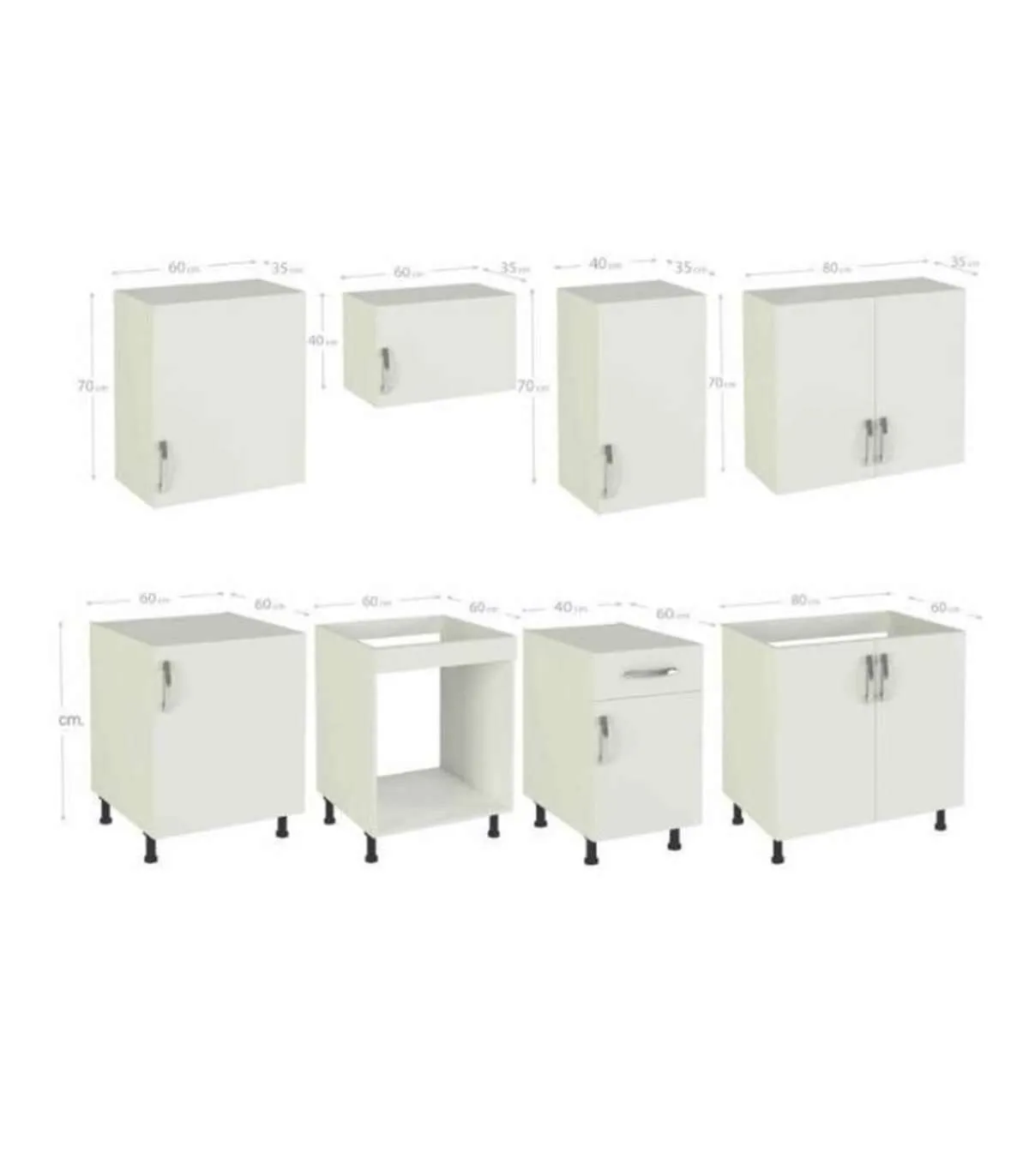 Cette cuisine peut être livrée avec une plinthe et un plan de travail en mélamine. Les deux seraient toujours en blanc mat, quelle que soit la couleur de la cuisine. Le plan de travail sera d'une seule pièce, ce qui vous permettra de le découper en fonction de la forme et de l'emplacement de votre évier et de votre plaque de cuisson.