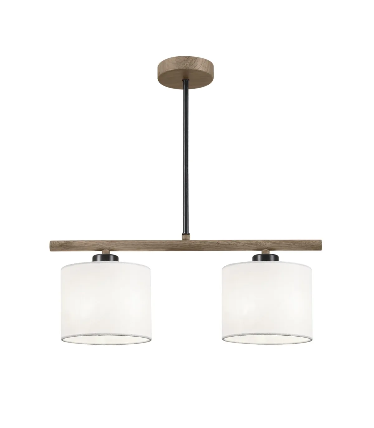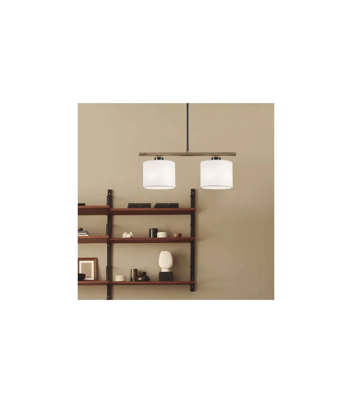 Lámpara lineal de 2 luces con pantalla modelo Berta, acabado negro, fabricada en metal, en acabados negro y madera y pantalla de tela color blanco. Usa bombillas E-27, compatible con bombillas Led E-27 (no incluidas).