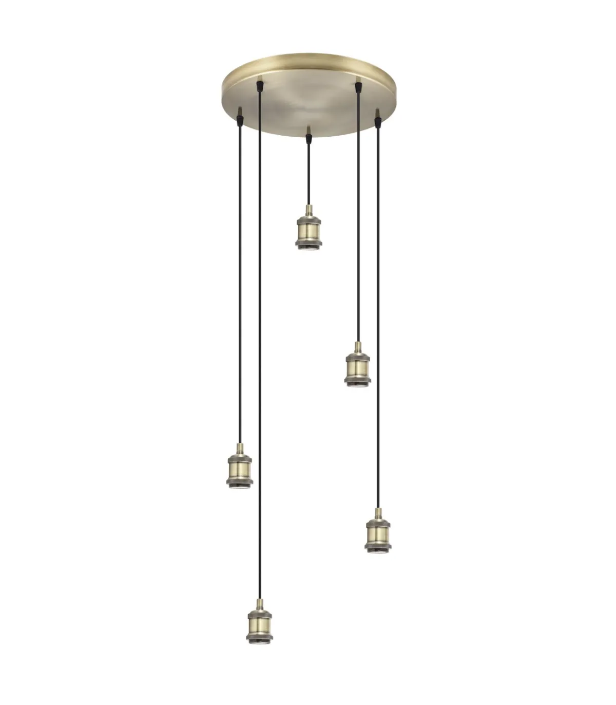 Lampara circular de 5 colgantes modelo ELKAN de diseño sencillo e inspiración industrial. Fabricado en metal cuero, con cinco puntos de luz. Compatible con bombillas Led E-27, recomendamos nuestras bombillas decorativas (no incluidas).