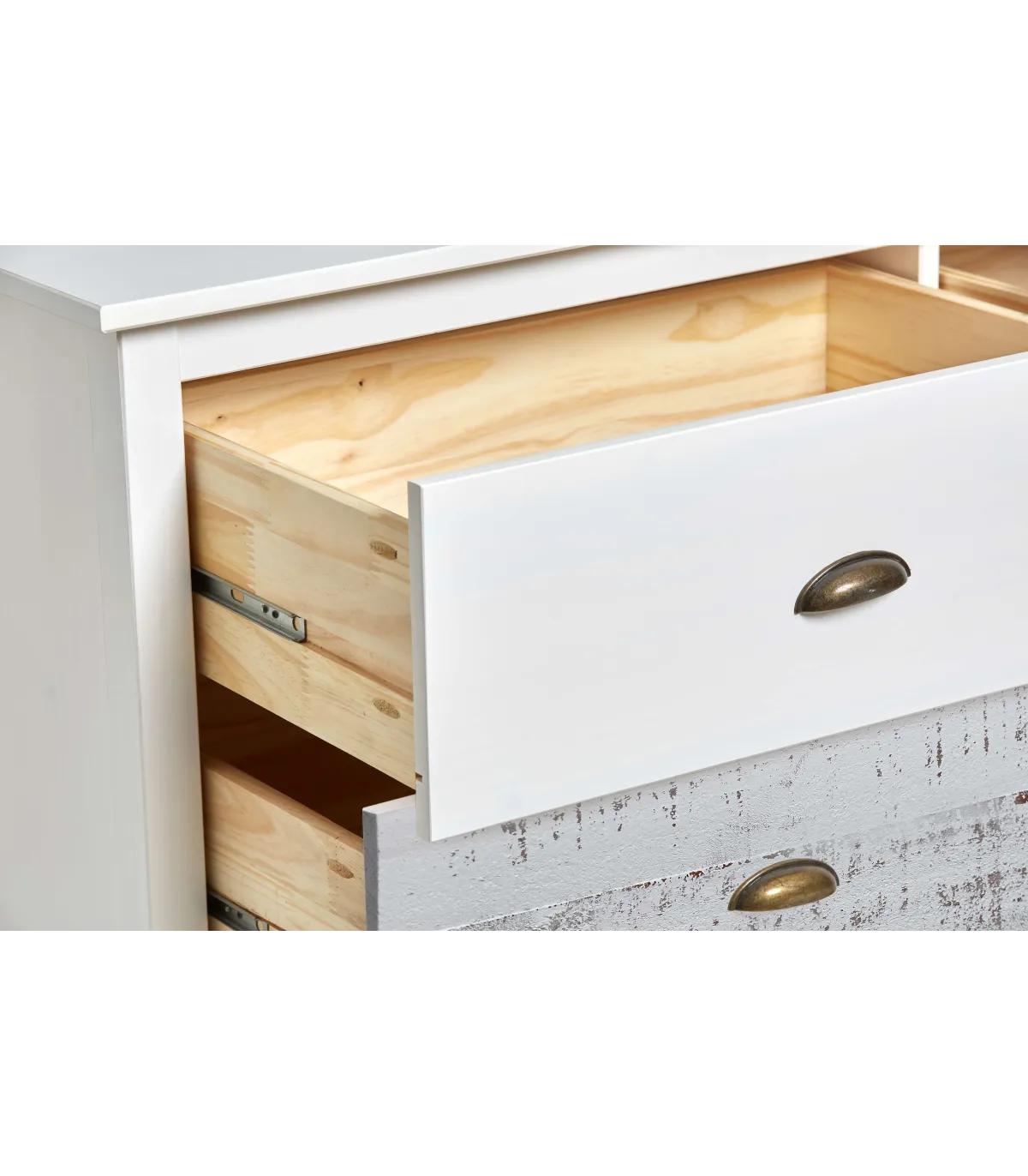 Commode romantique en bois de pin, avec structure et deux tiroirs supérieurs laqués en blanc, et 4 tiroirs inférieurs de différentes couleurs, avec une finition décapée. Poignées métalliques en forme de coquille et glissières métalliques.