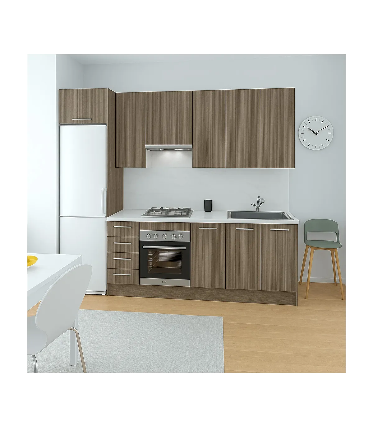 Cocina en kit en roble compuesta por 5 módulos altos, 4 bajos y 3 costados decorativos con un ancho total de 285cm. Encimera y zócalo opcionales.