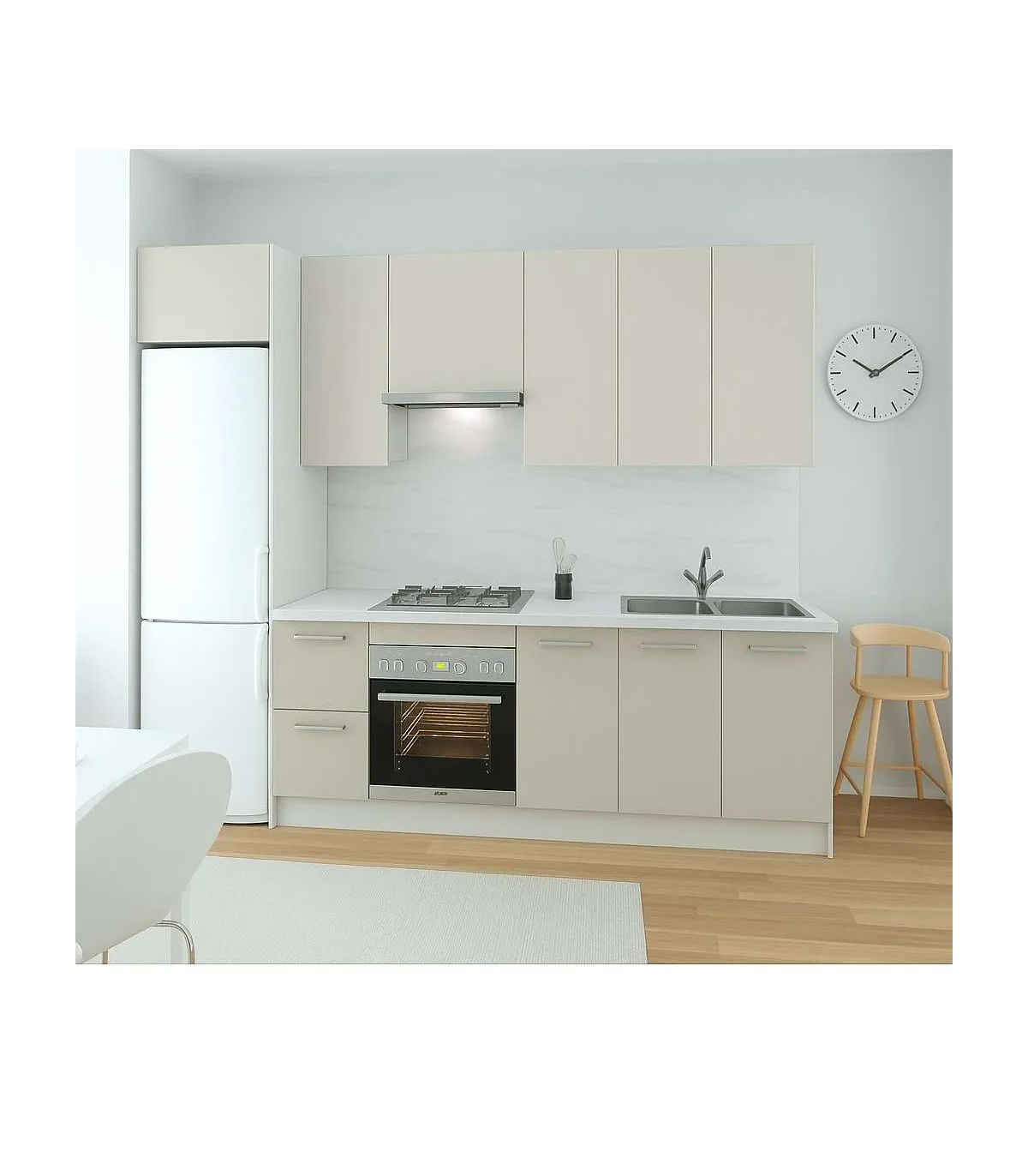 Cocina en kit en roble compuesta por 5 módulos altos, 4 bajos y 3 costados decorativos con un ancho total de 285cm. Encimera y zócalo opcionales.