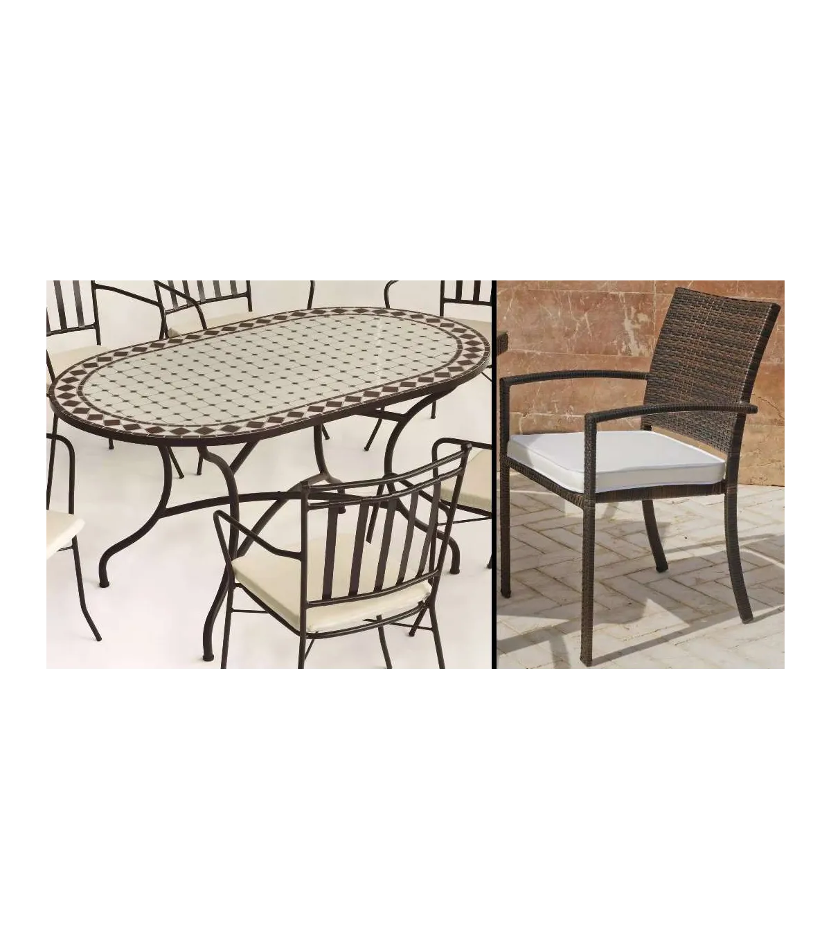 Conjunto de mesa + 6 sillones con cojines de forja para jardín y terraza. Fabricada de acero forjado color bronce, con tablero de mosaico cerámico/piedra natural resistente.