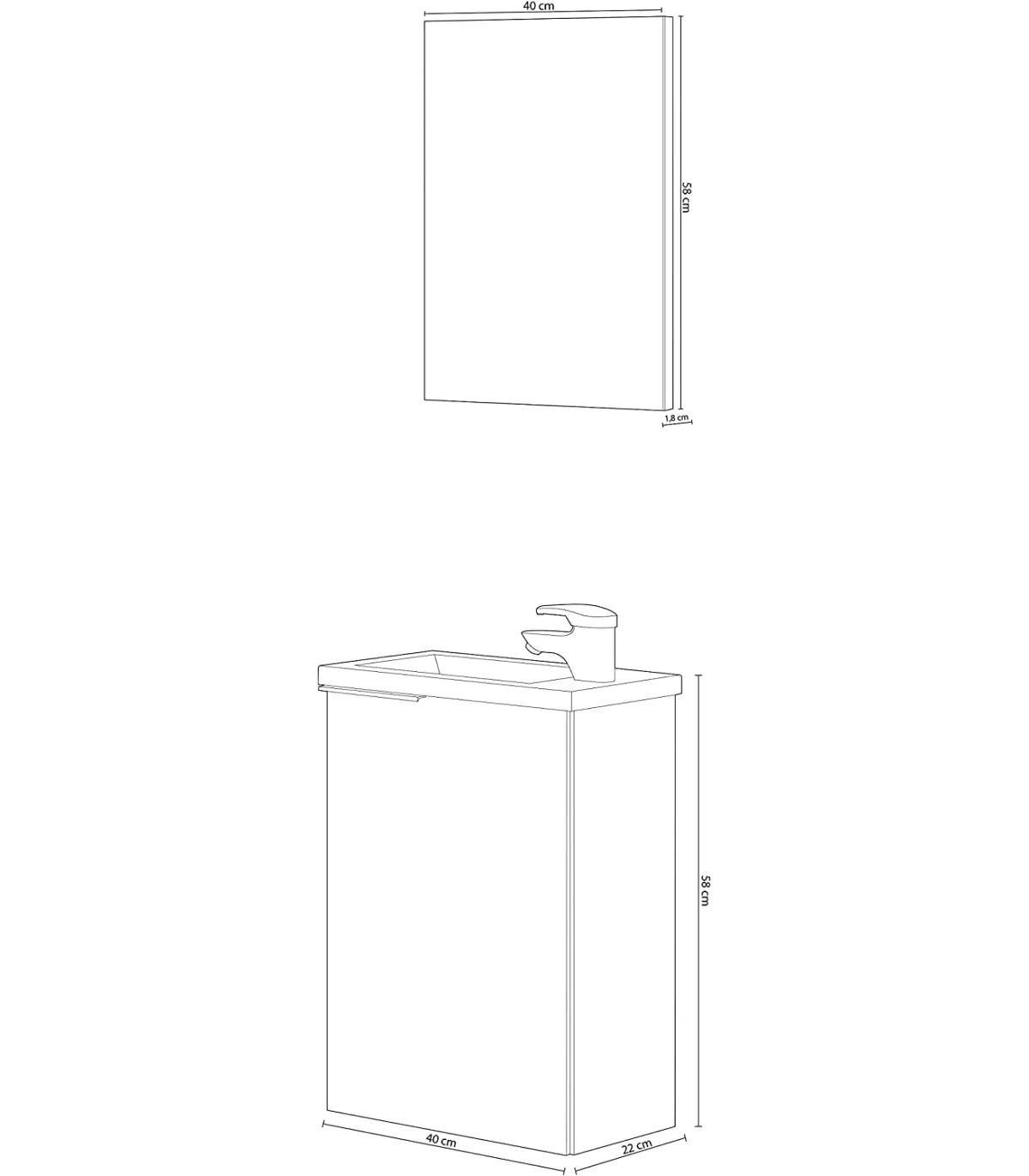 - Mueble lavabo: 58 cm (alto) x 40 cm (ancho) x 22 cm (prof.)