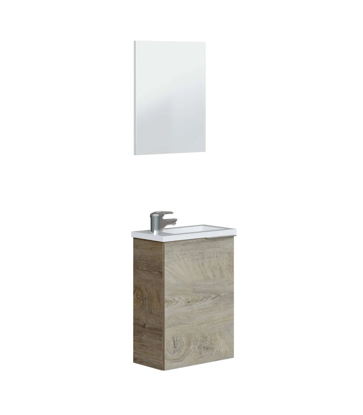 Elegante Mueble de Baño en color imitación a madera, lavabo en color blanco y espejo a juego.