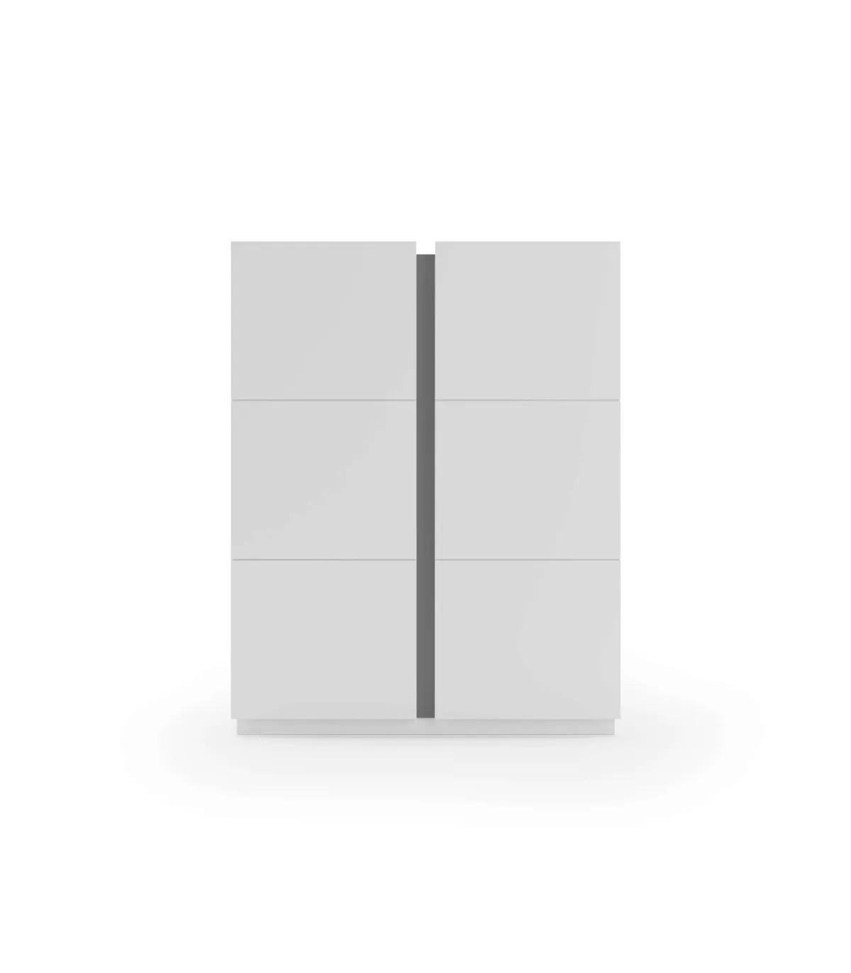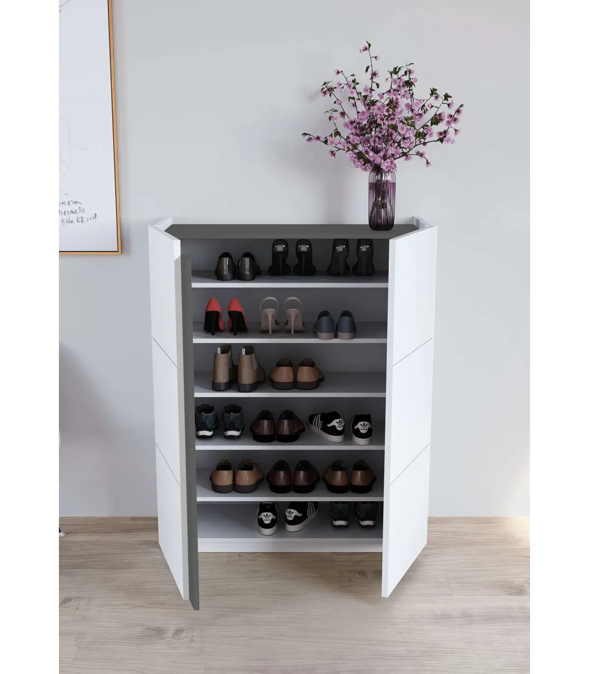 Zapatero modelo OSLO en varios colores en melamina con 2 puertas asimétricas, un pequeño espacio decorativo en la parte izquierda superior y con las patas en forma de cuña en haya lacadas.