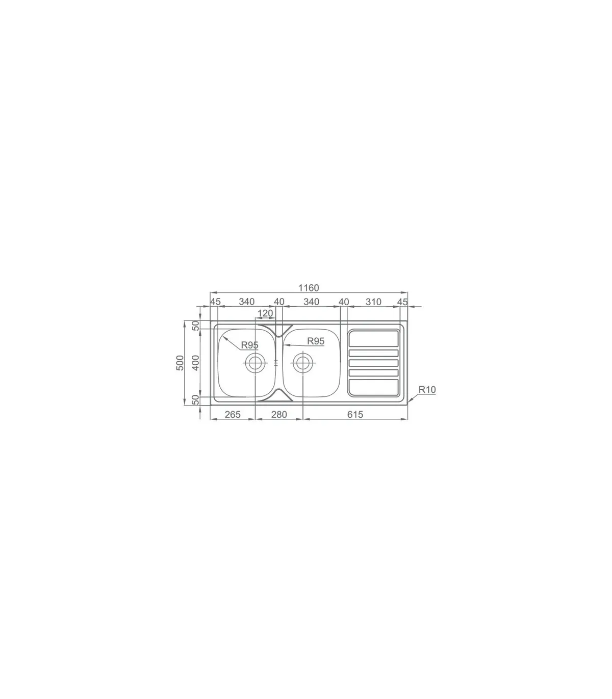 Évier à deux bacs + égouttoir. Il a une bonne taille, 1,16 mètres au total.
