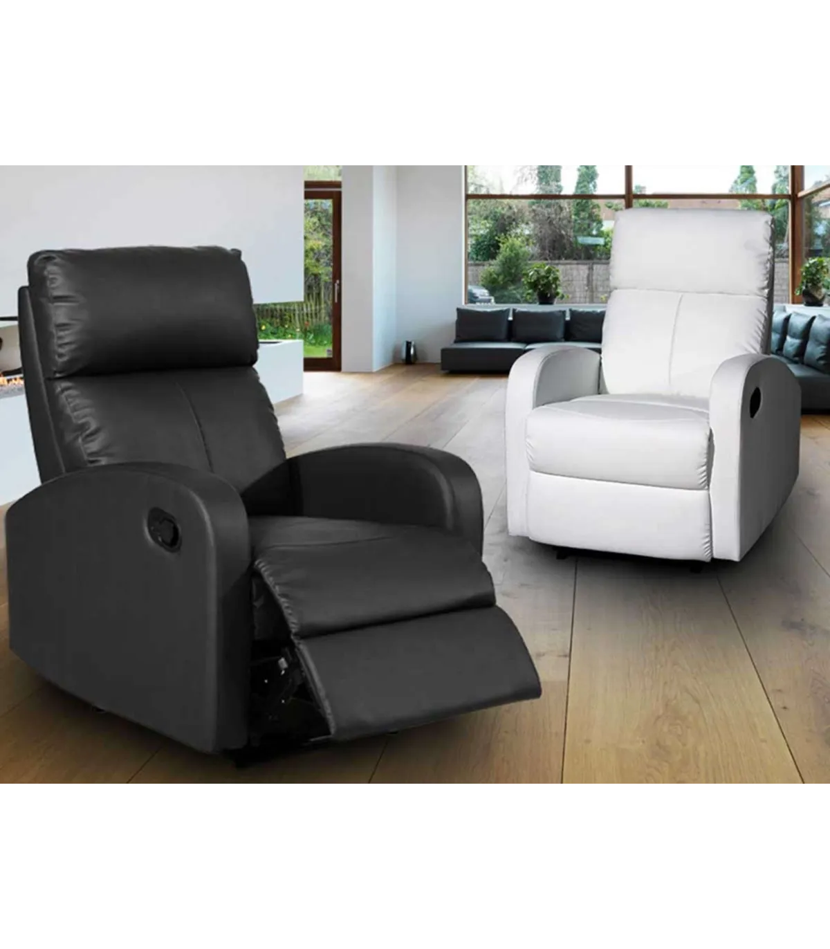 Sillón relax modelo Bristol, reclinable mediante palanca manual, tapizado en polipiel marrón, blanco , negro y en tela terciopelada gris.