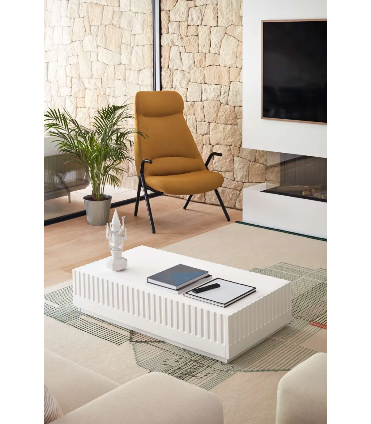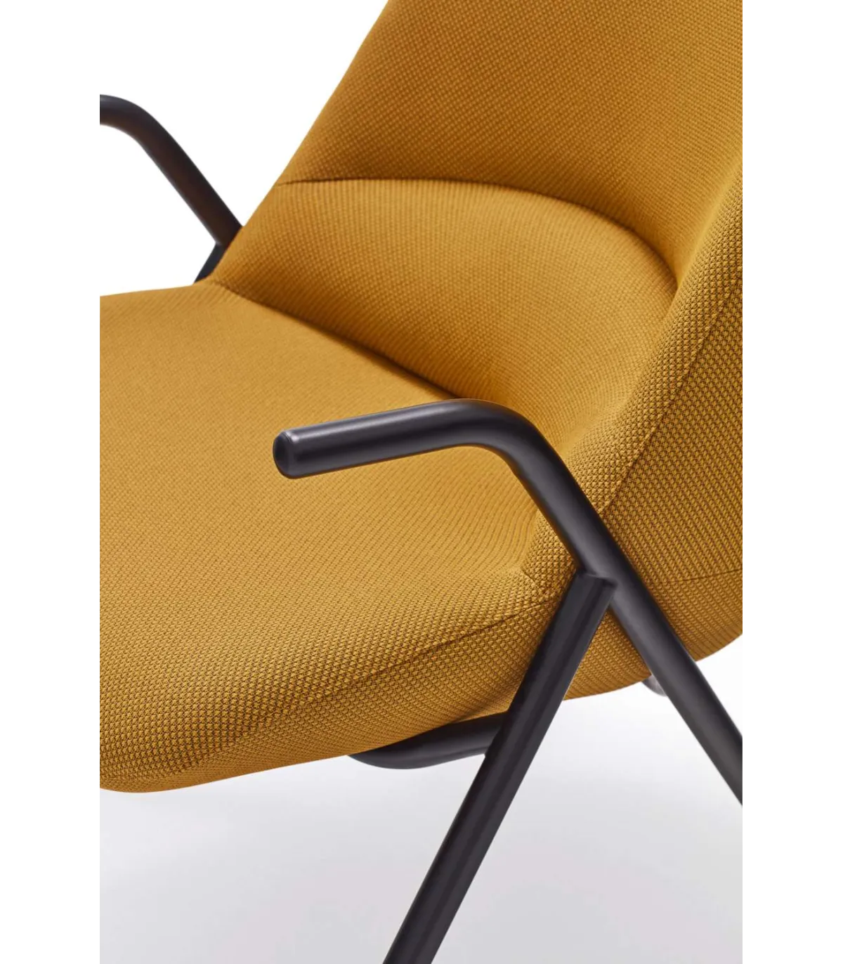 Butaca modelo Dins-Alta. Tapizado en tela de diferentes colores azul marino, crema, mostaza y verde oscuro. Las patas, que recubren todo el asiento, son metálicas de una sola pieza en negro.