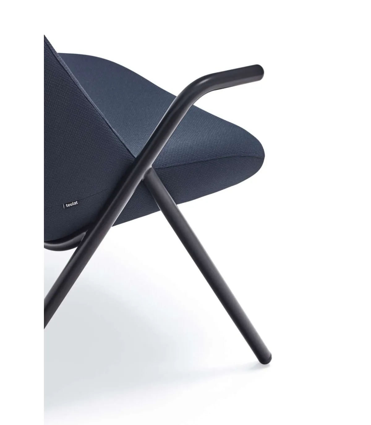 Butaca modelo Dins. Tapizado en tela de diferentes colores azul marino, crema, mostaza y verde oscuro. Las patas, que recubren todo el asiento, son metálicas de una sola pieza en negro.