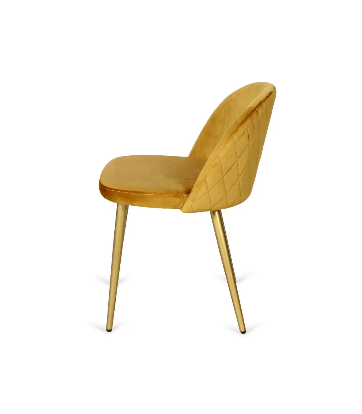 Chaise tapissée de velours doré, avec des surpiqûres en forme de diamant à l'arrière du dossier et quatre pieds en métal doré. Hauteur du siège : 48 cm.