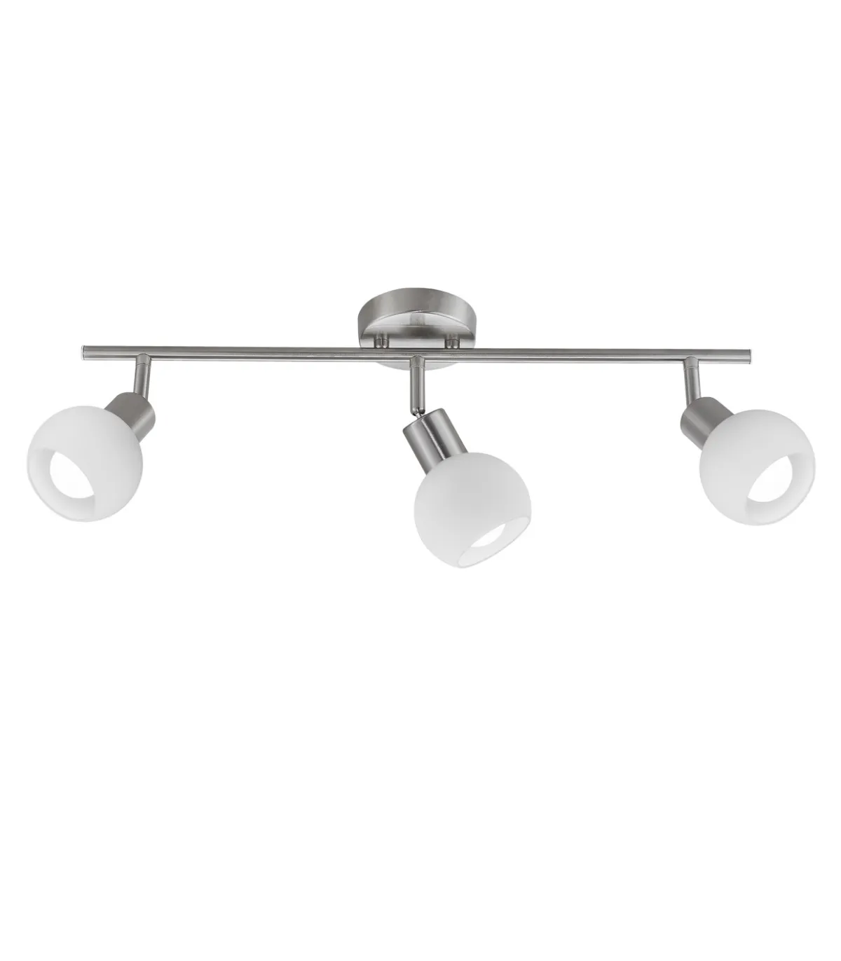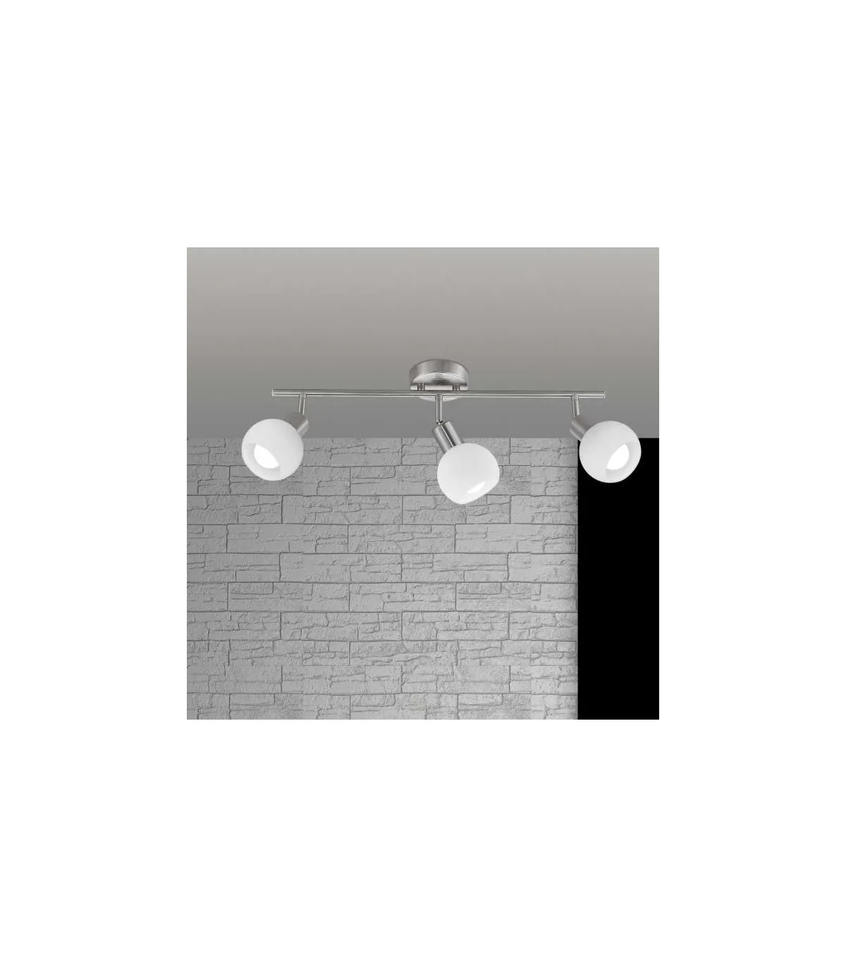 Plafonnier Vera à trois lumières. Fabriqué en métal avec une finition nickel satiné et des abat-jour en verre opale. Vous pouvez orienter les deux lampes dans la direction que vous préférez grâce au joint à rotule. Il peut être placé comme une applique murale et illuminer votre salon, votre salle à manger, votre couloir et votre chambre.