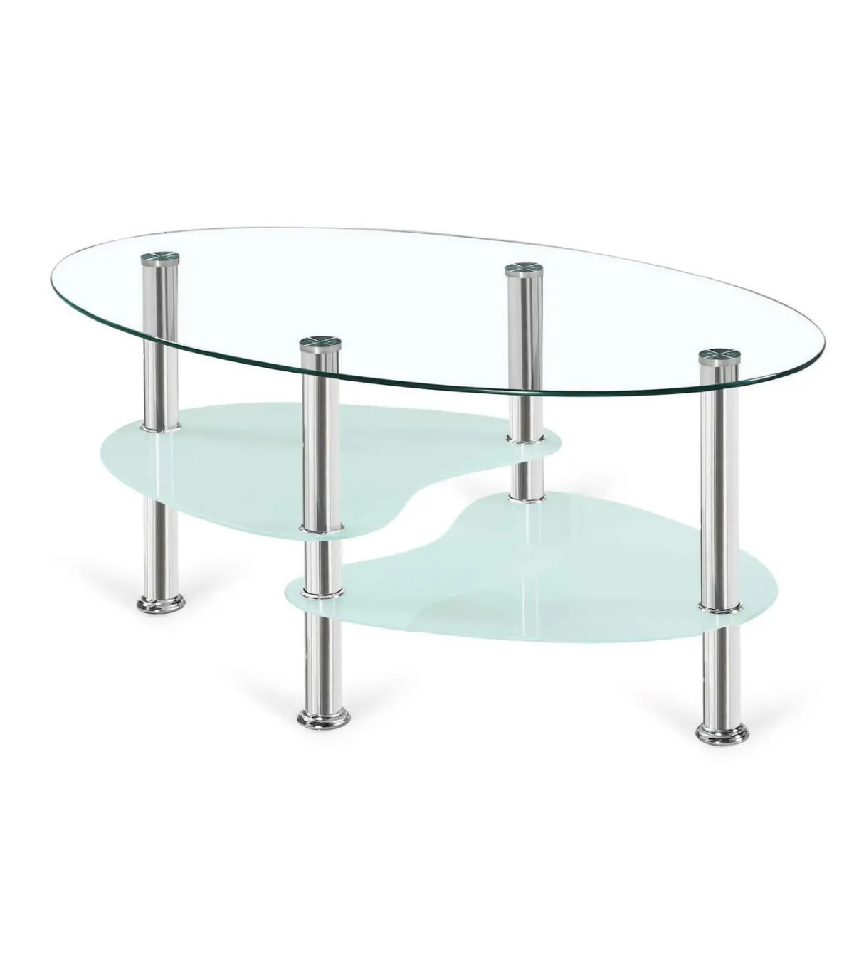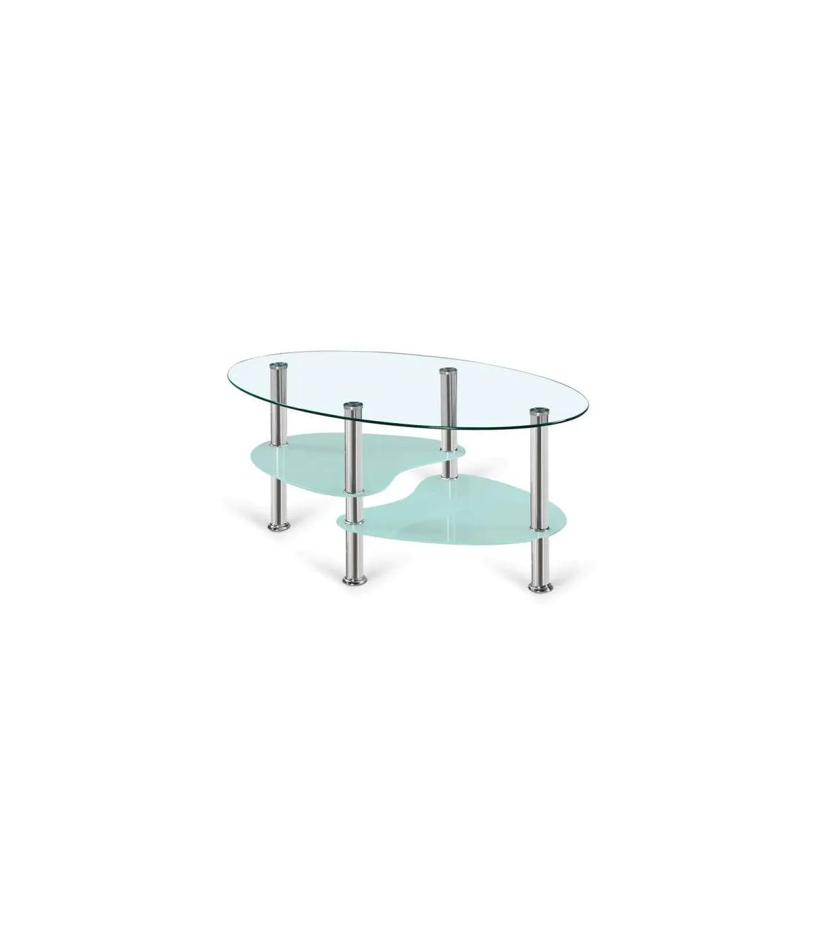 Table basse avec structure en acier inoxydable et plateau en verre trempé de 8 mm d'épaisseur.