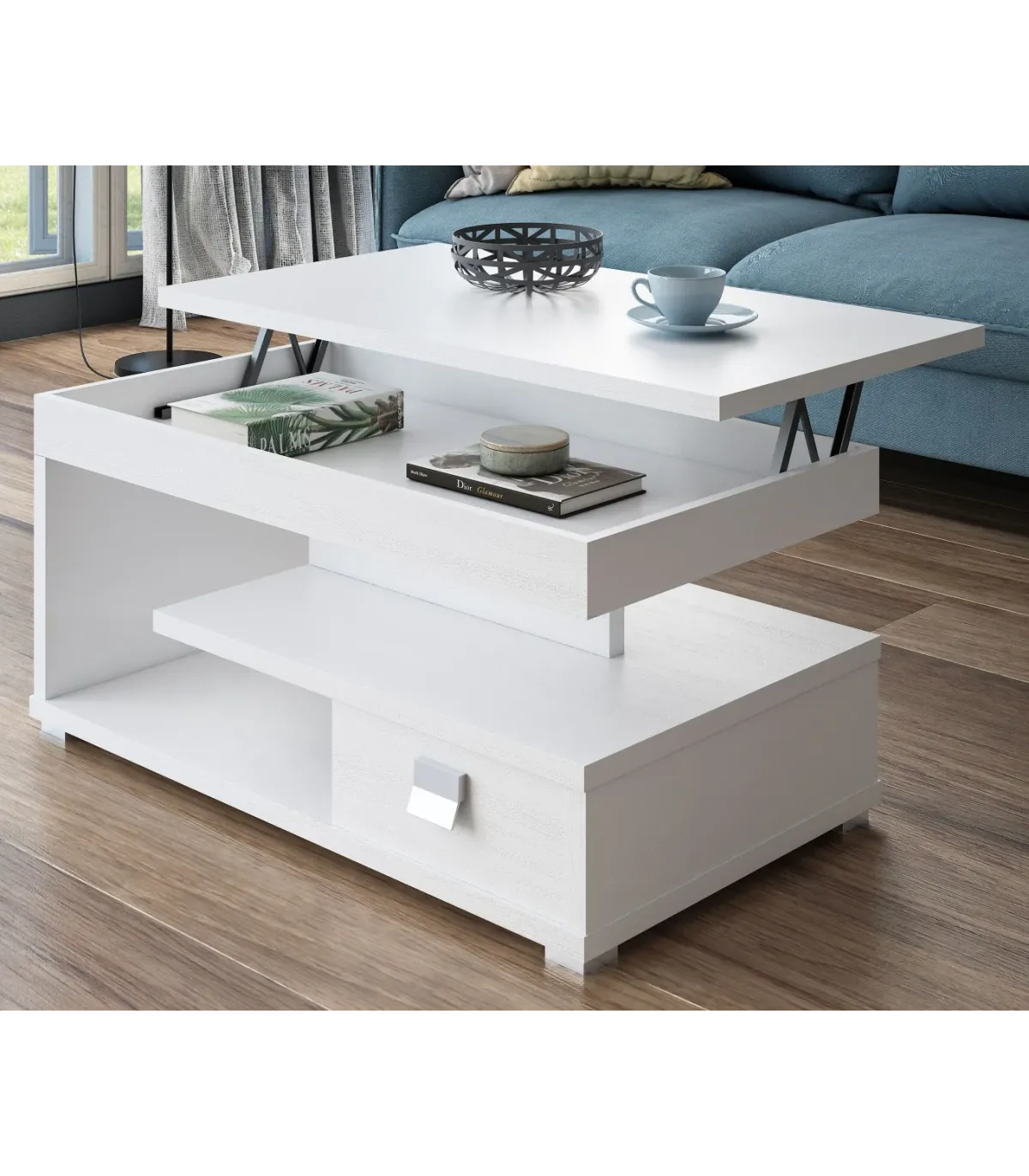 Ce modèle de table basse relevable mesure 111 cm de largeur x 56 cm de profondeur x 51 cm de hauteur lorsqu'il est fermé, et atteint une hauteur de 63 cm lorsque le plateau est relevé. Le plateau de la table est solide et robuste, avec une épaisseur de 3 cm.