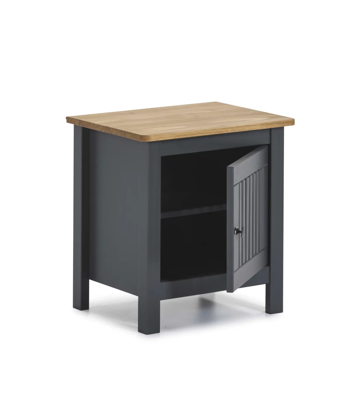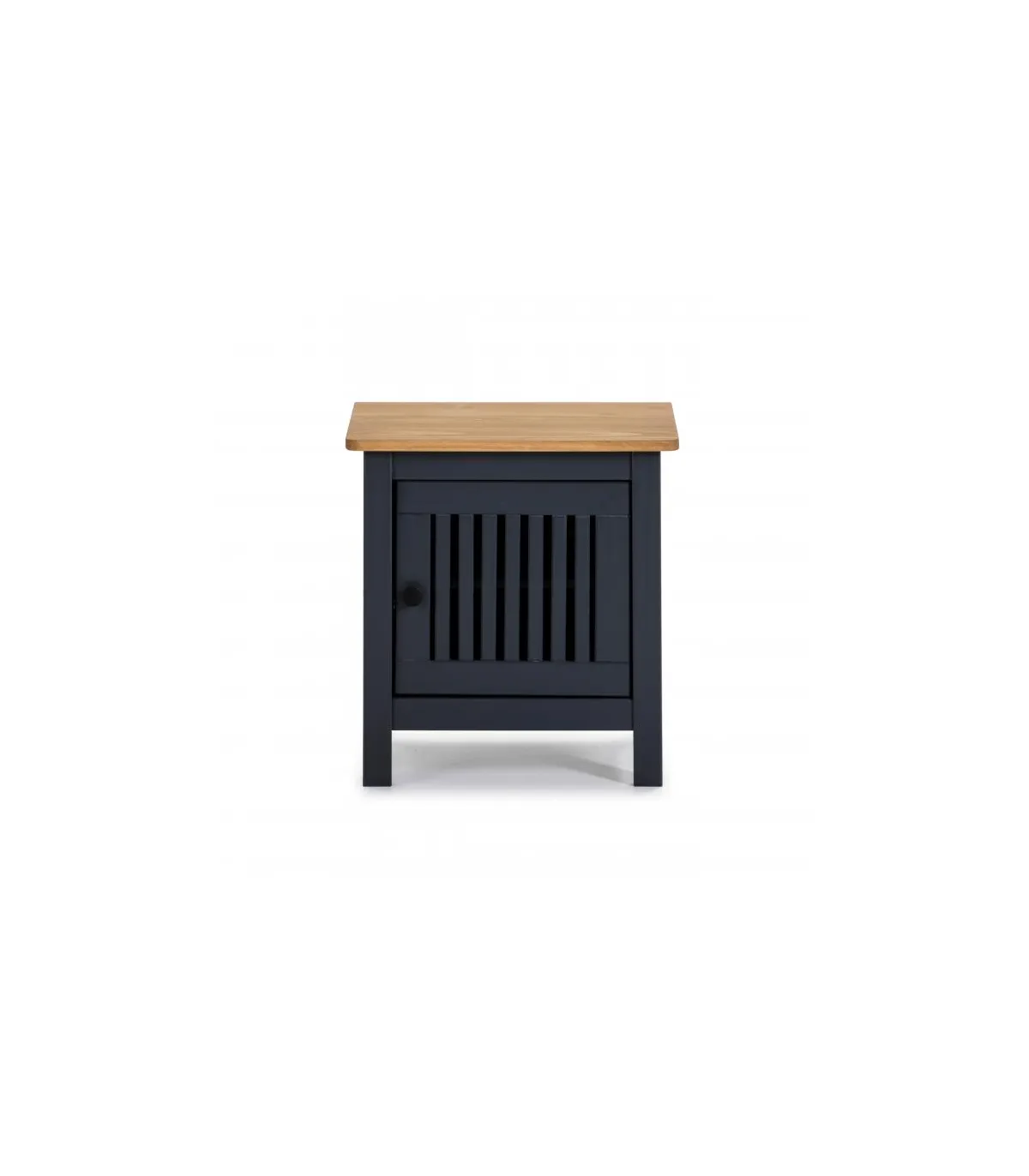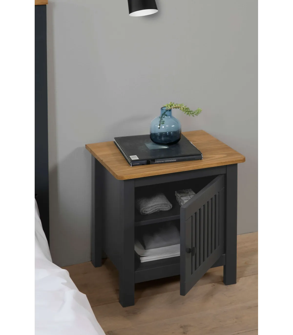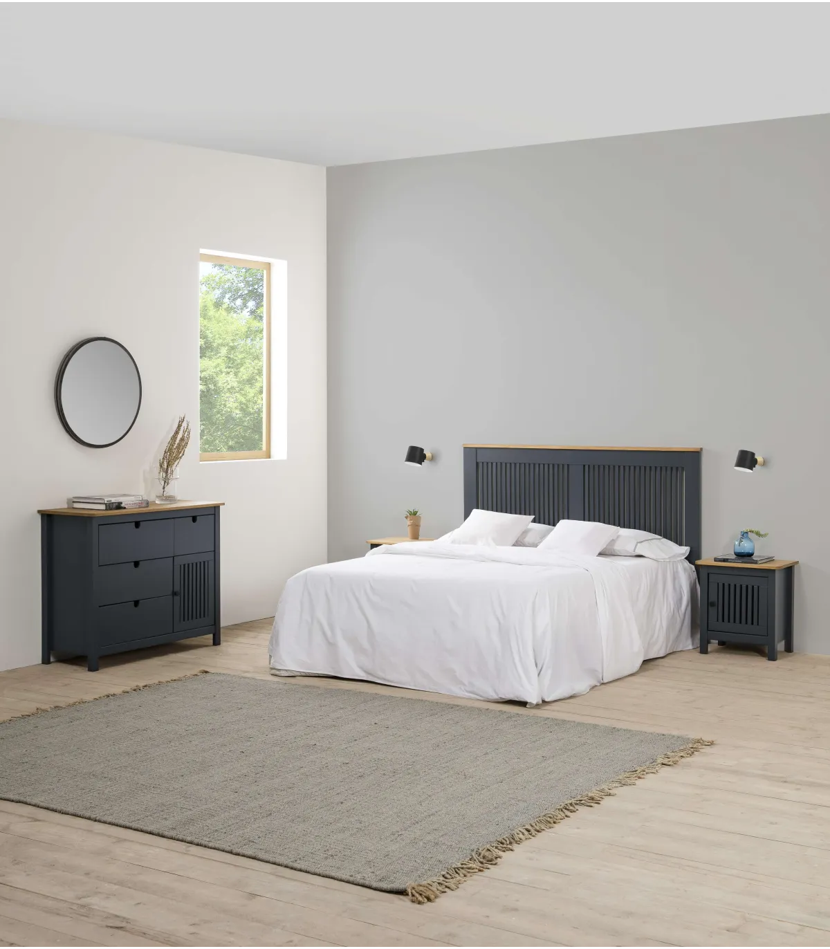 Meuble TV de la collection Bruna de style nordique, avec deux tiroirs et une porte coulissante en bois de pin gris. Plateau en bois de couleur naturelle avec finition en cire.