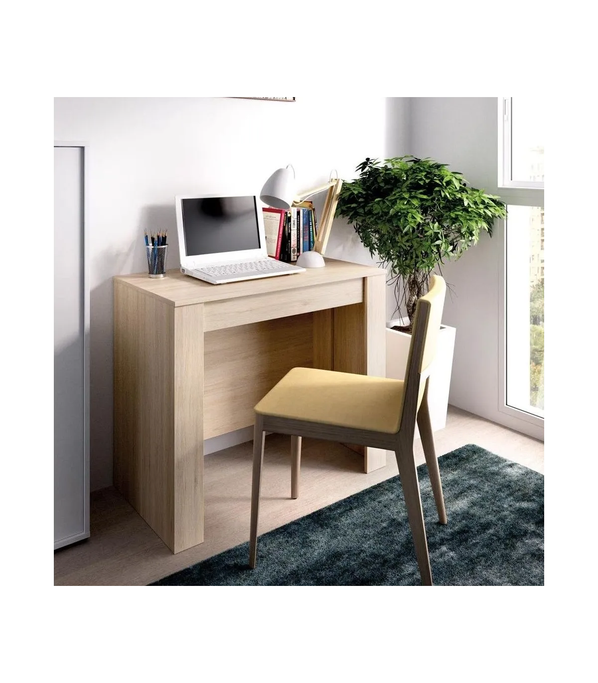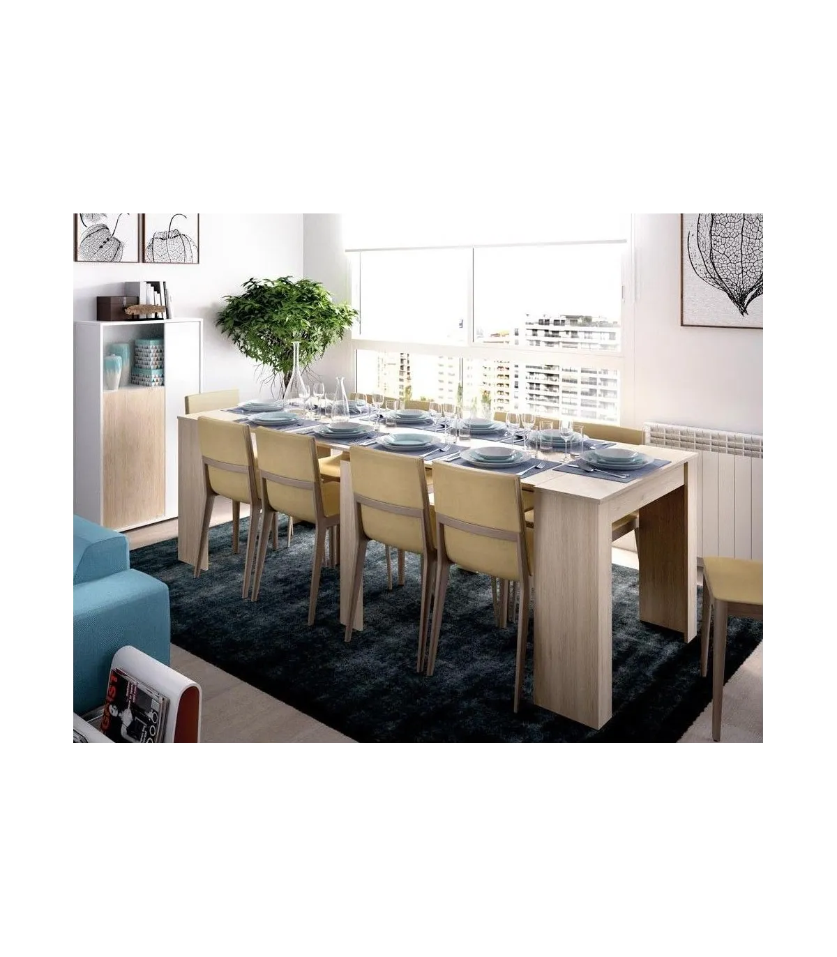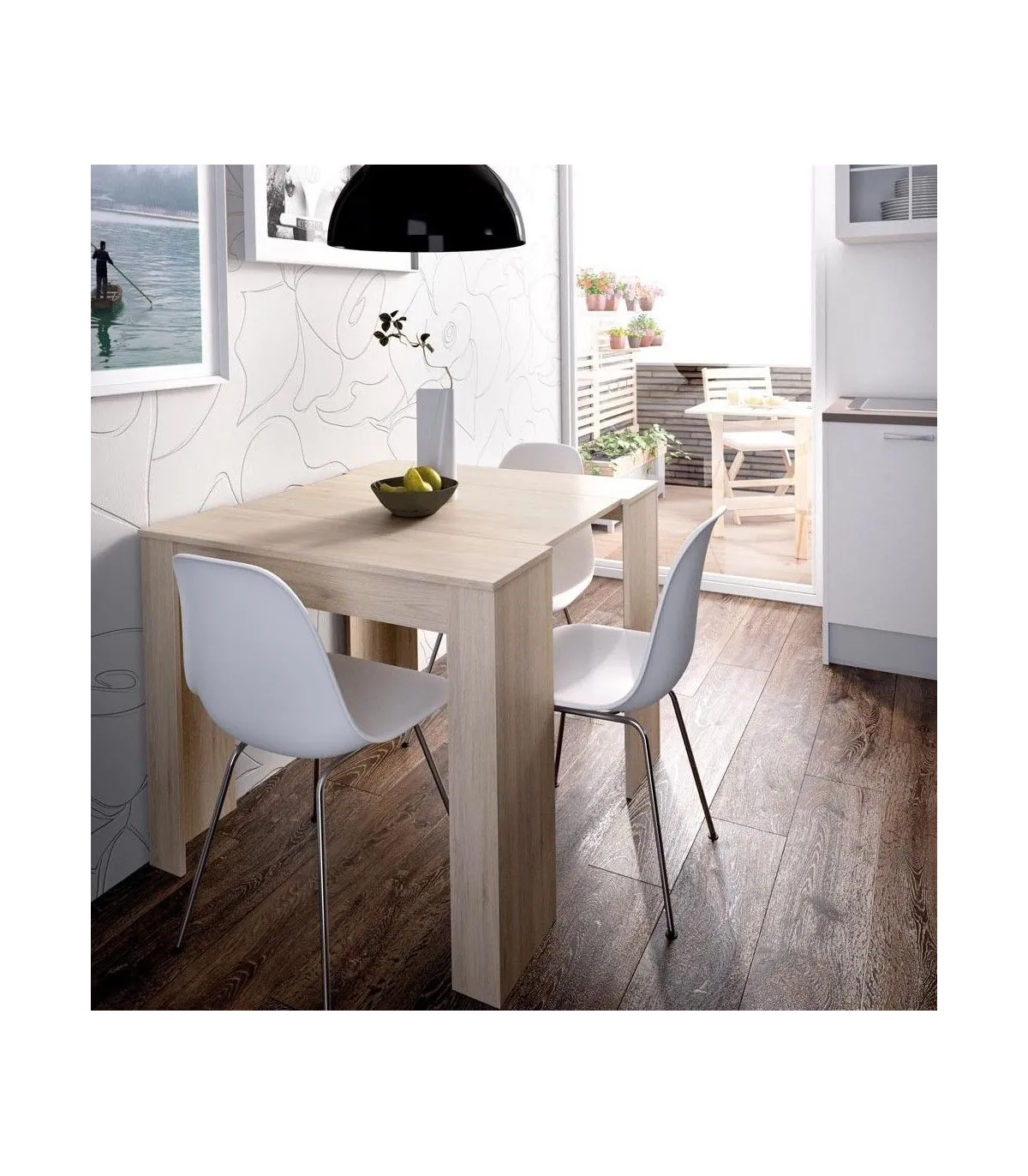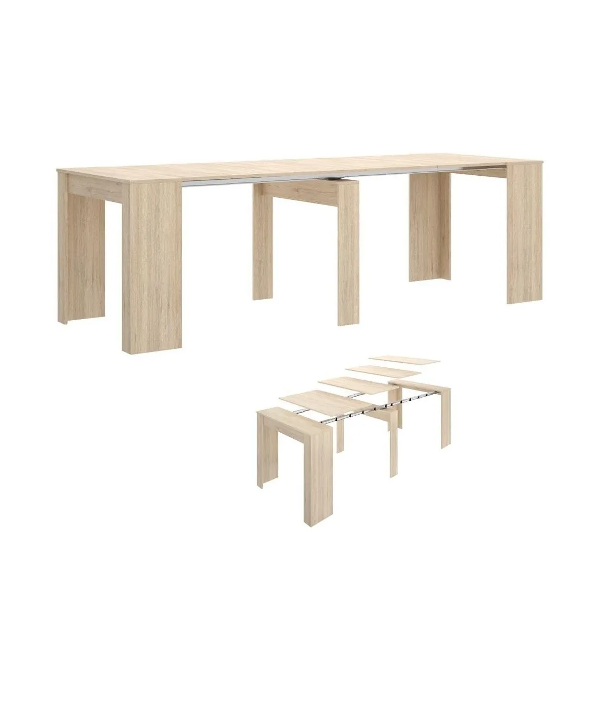 Mesa de Salón extensible en 5 posiciones diferentes en color natural perfecta. Es perfecta si necesitas un mesa de gran capacidad pero que no ocupe espacio en el día a día.