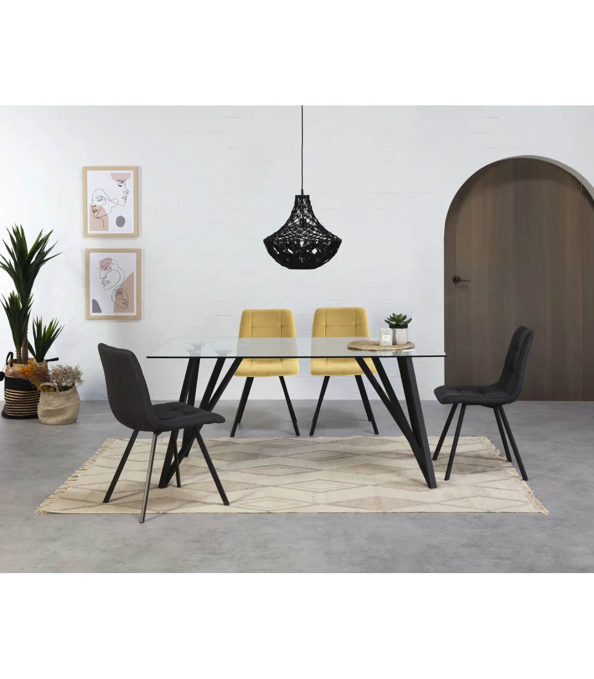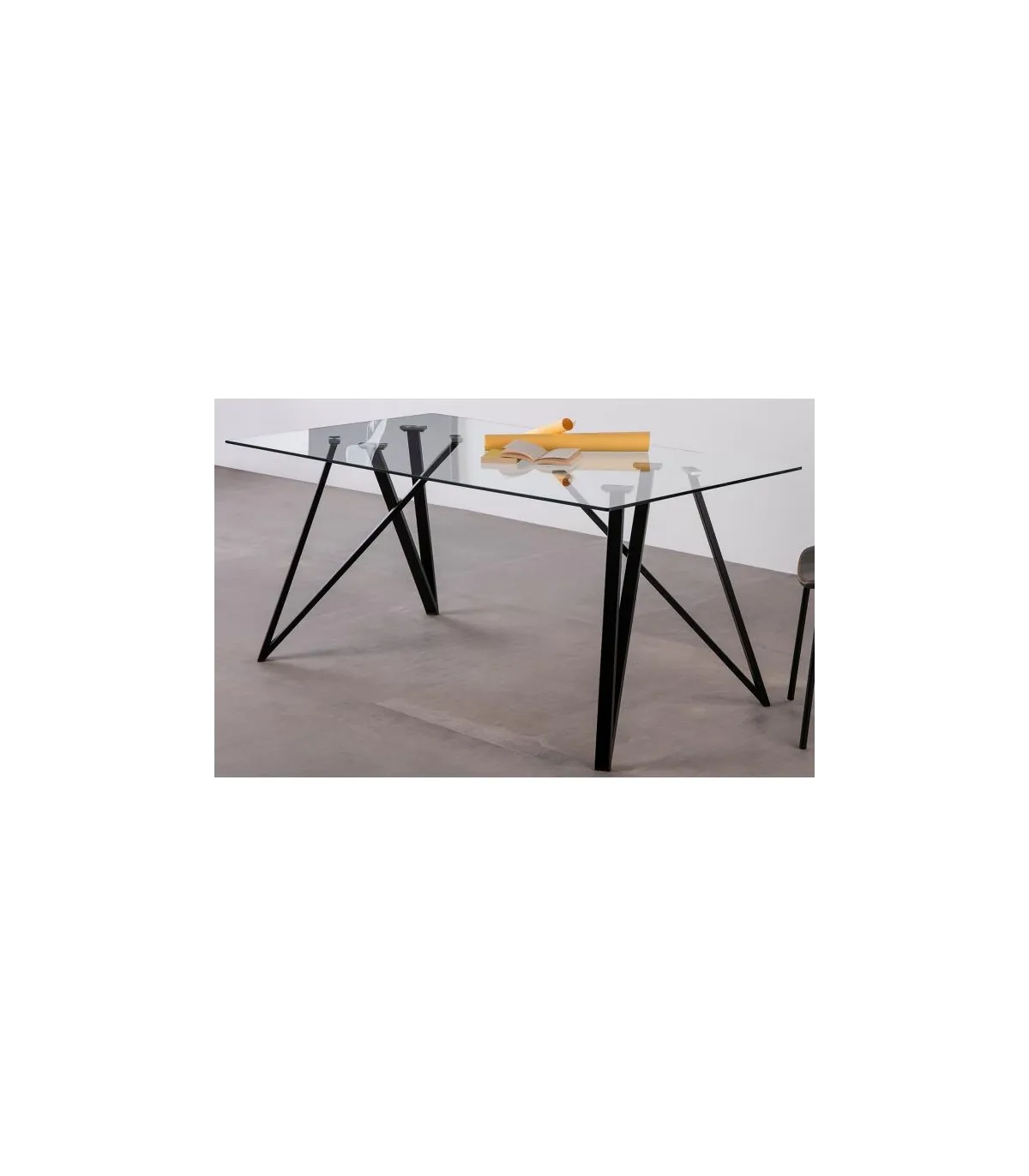 Table de repas rectangulaire Gaia avec plateau en verre de 10 mm d'épaisseur. Matériaux : plateau en verre trempé et pieds en métal noir
