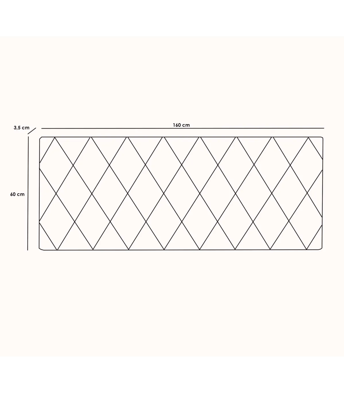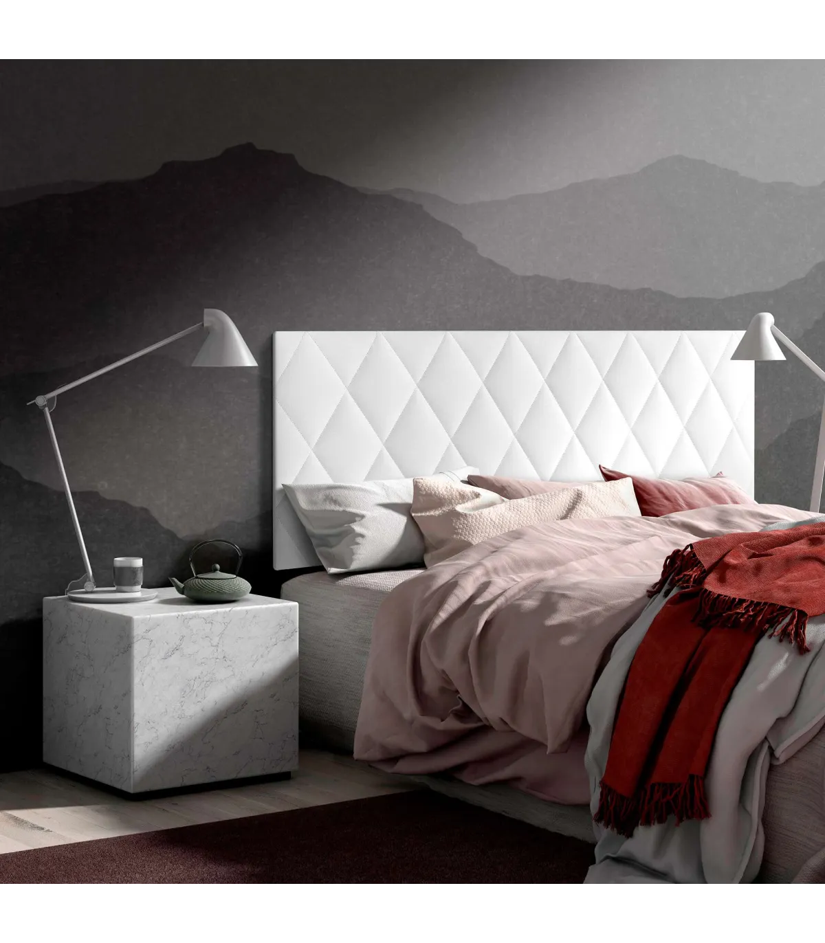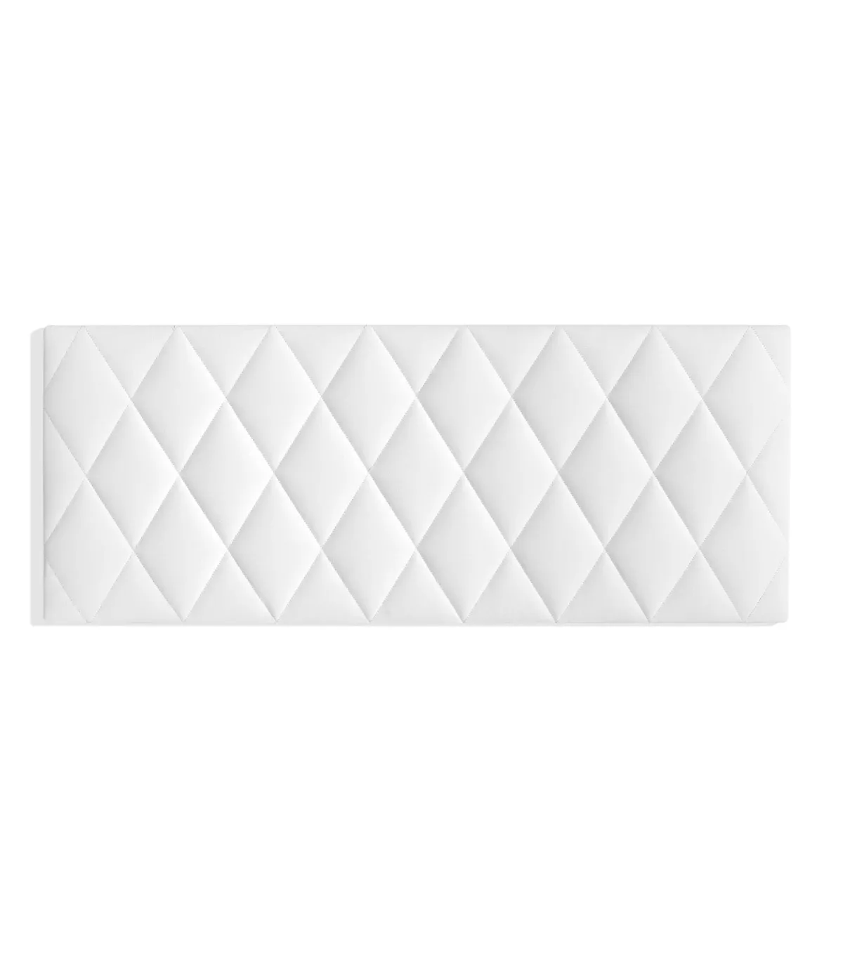Cabecero horizontal tapizado, con un acabado de algodón guateado en su interior con marco de madera de pino y con costuras haciendo rombos. Acabado en tejido suave en color blanco que repele las manchas.