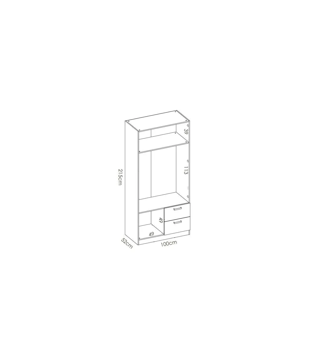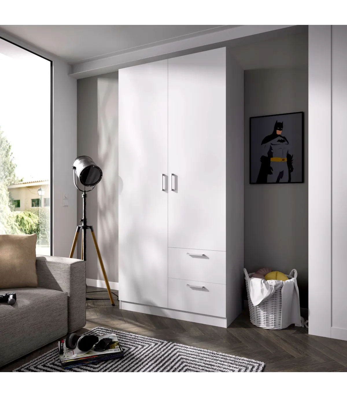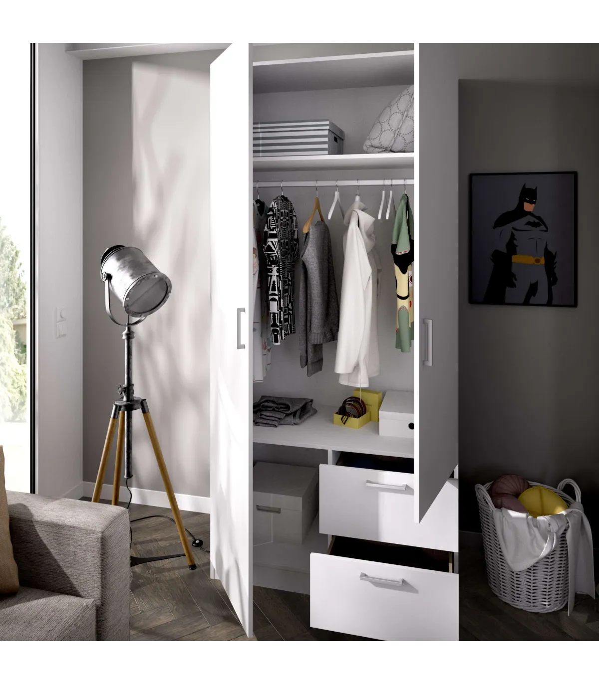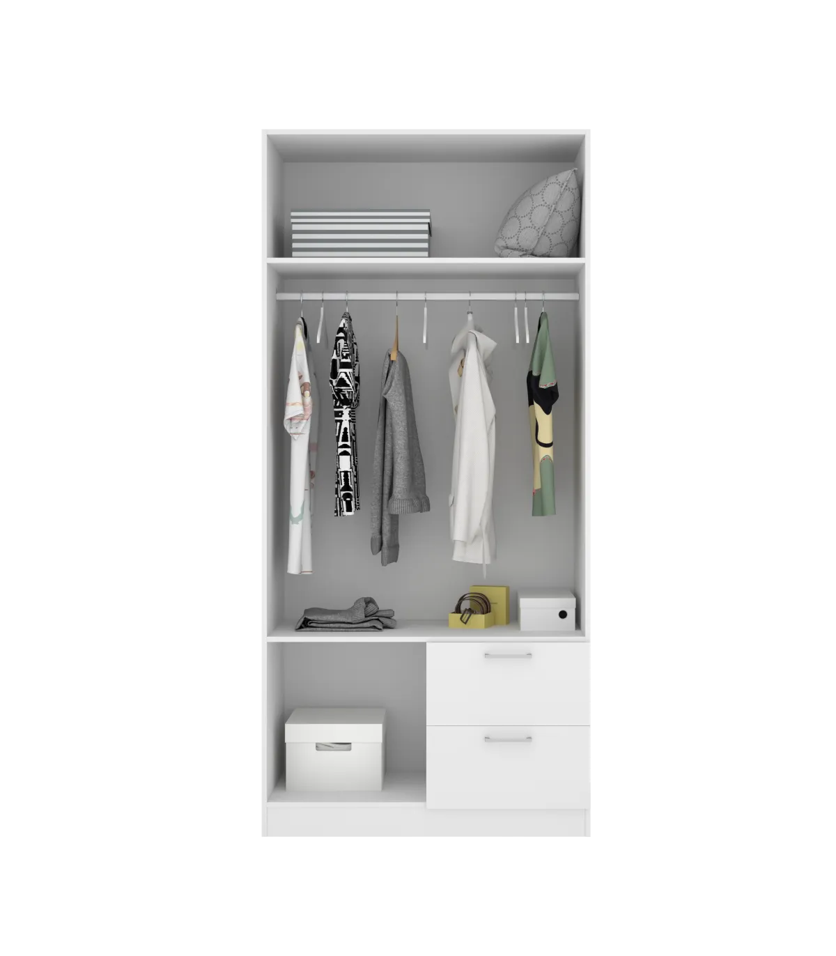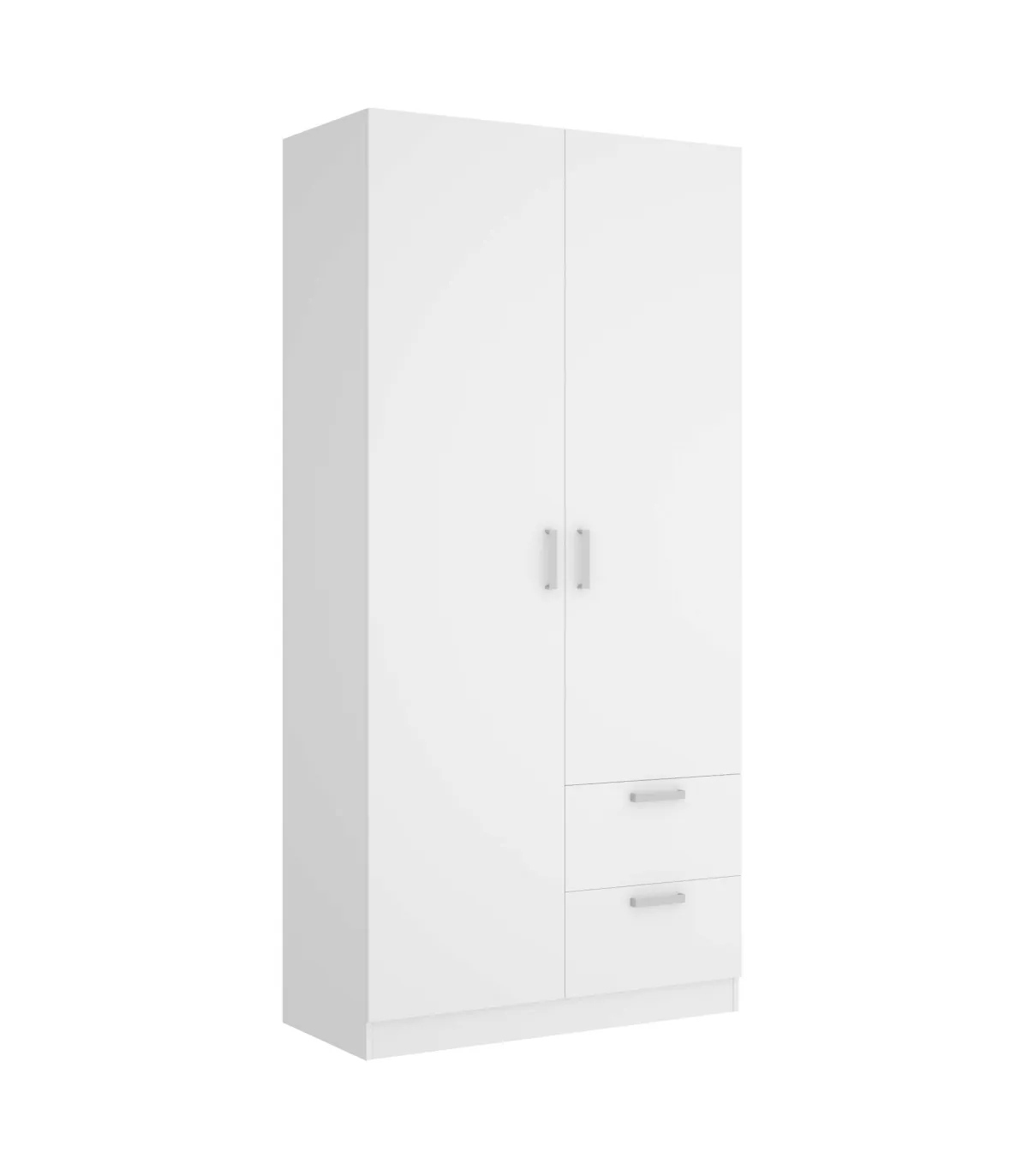 Alto roupeiro com duas portas dobrável e duas gavetas em branco, é a solução perfeita para pequenos quartos. Com um design elegante e funcional, oferece amplo espaço de armazenamento enquanto combina harmoniosamente tons neutros que iluminam e expandem o espaço.