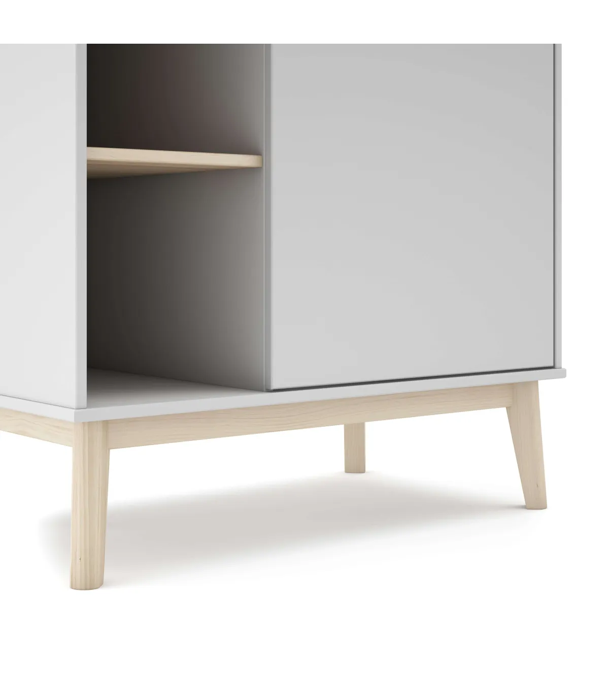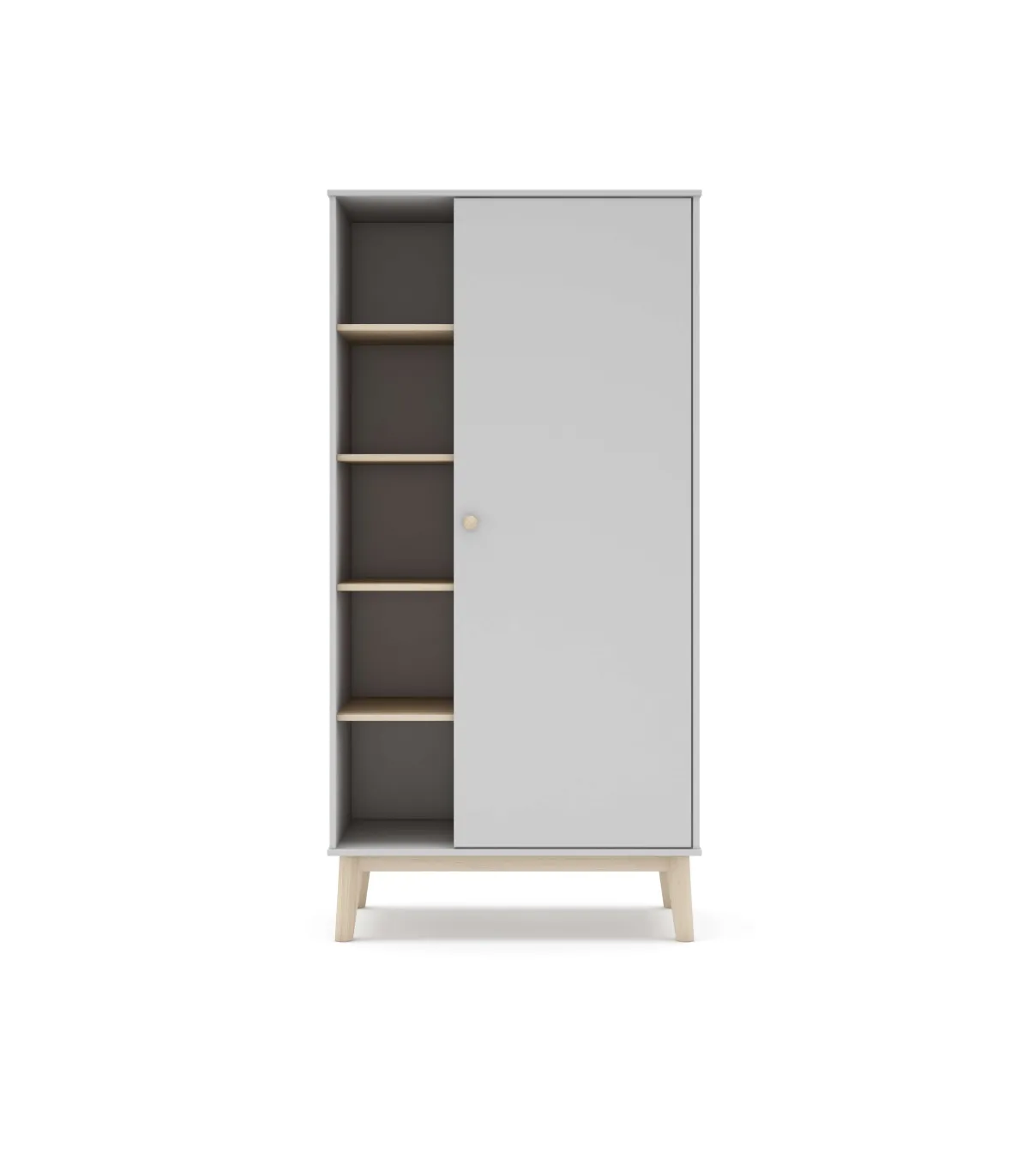 O armário é um mobiliário de uma única porta e cinco buracos, feitos de madeira de DM lacada e pinheiro natural com um acabamento branco combinado com cera branca. Tem um lado que contém uma porta e bar para pendurar roupas maiores, enquanto do outro lado há quatro prateleiras de madeira abertas para organizar vários acessórios. Seu design prático e elegante torna uma solução versátil para armazenar e organizar roupas e acessórios em casa.