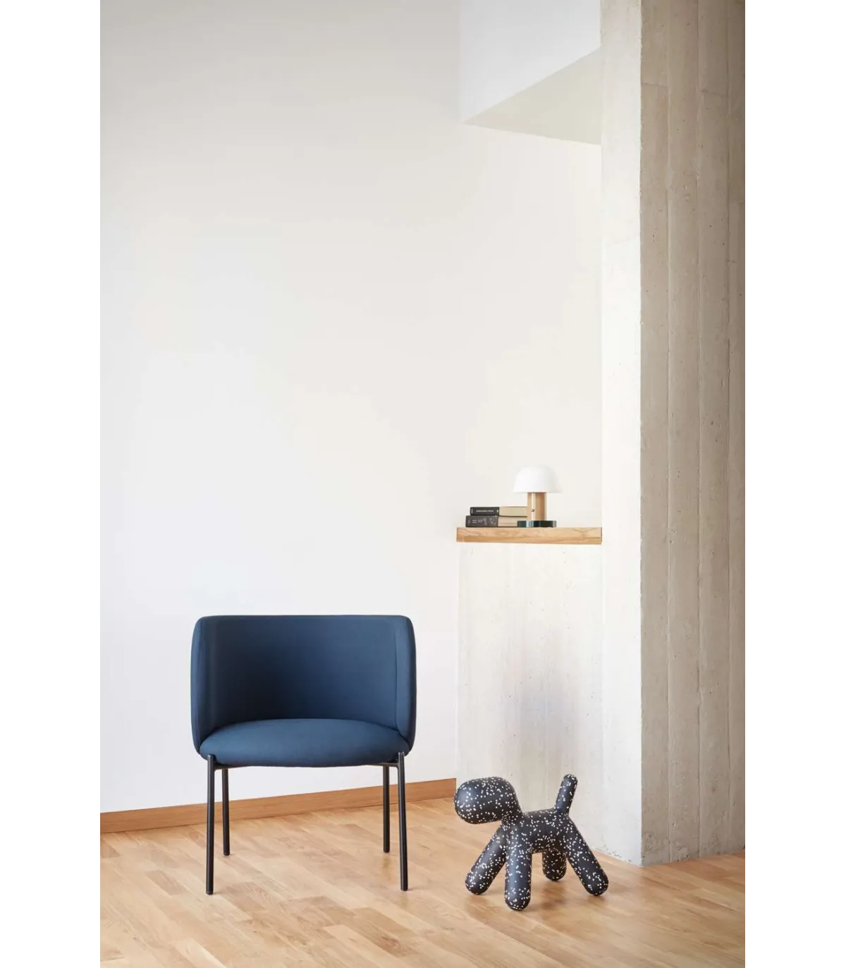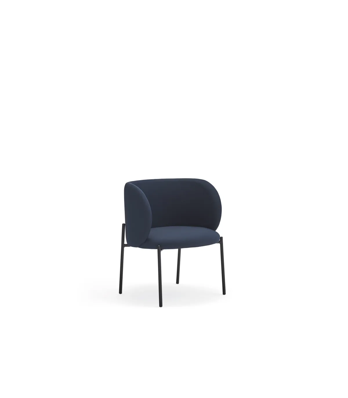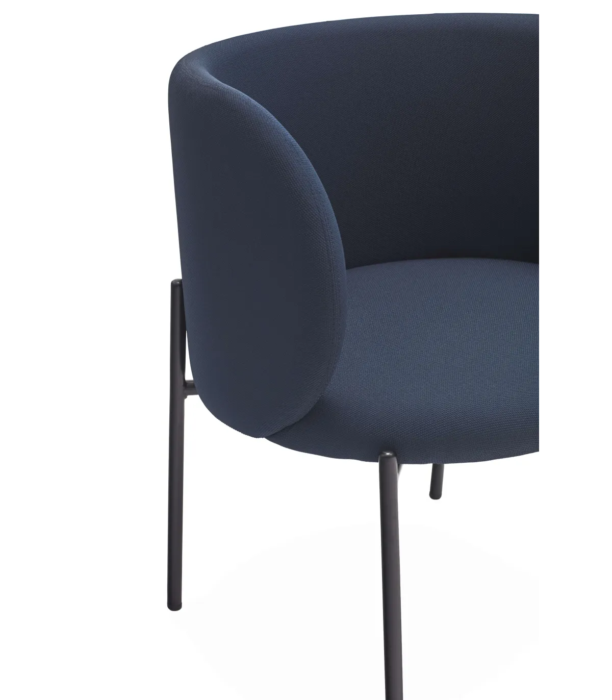 Poltrona modelo Mogi. Estofado em tecido azul escuro. As pernas, que cobrem todo o assento, são metálicos de uma peça preta.