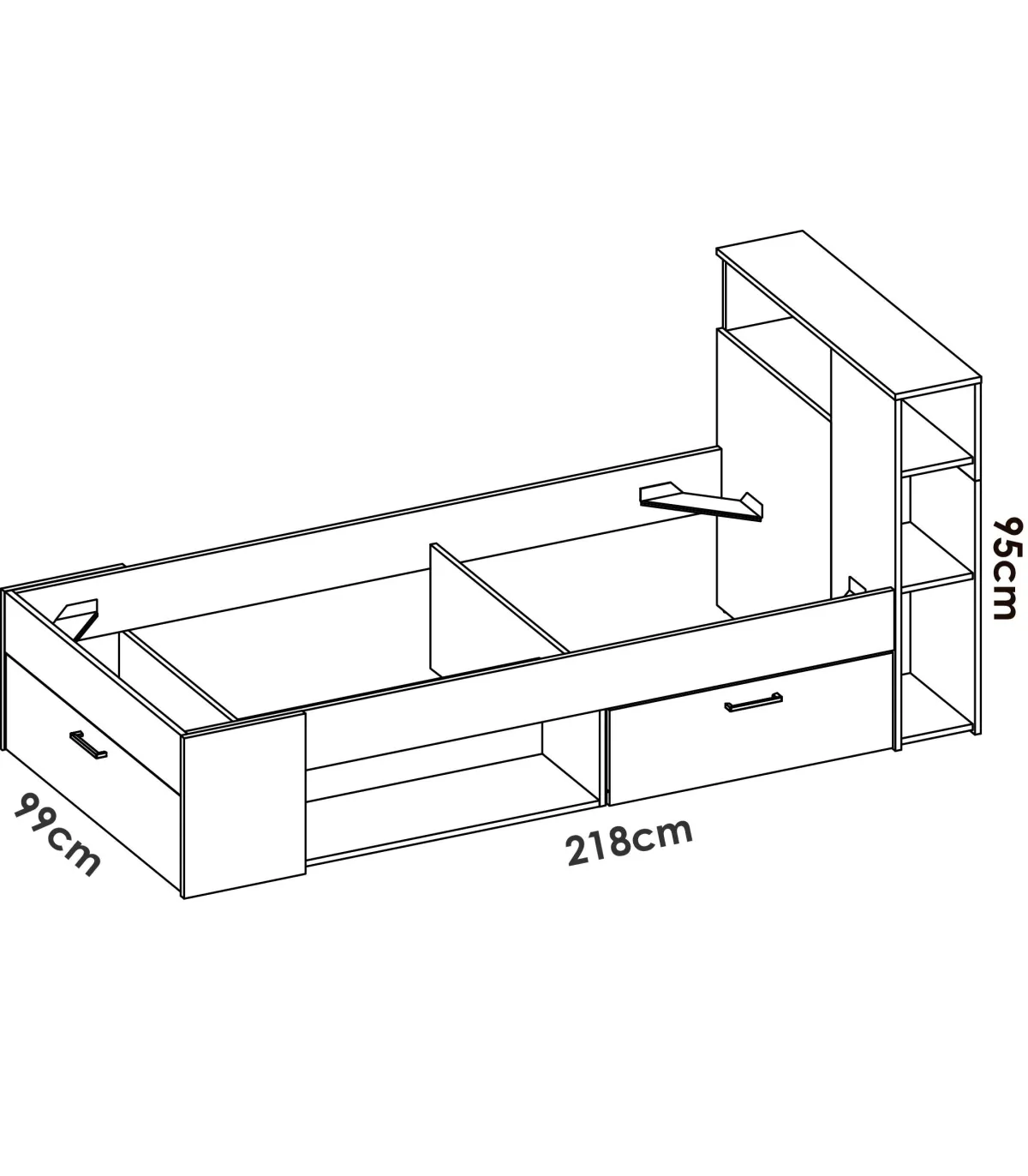 Cama compacta para colchão 90 x 190cm com gaveta lateral e orifício diafano, porta dobrável com bandeja na parte de trás e livraria na cabeça. Grandes espaços para armazenar e ter tudo em ordem.