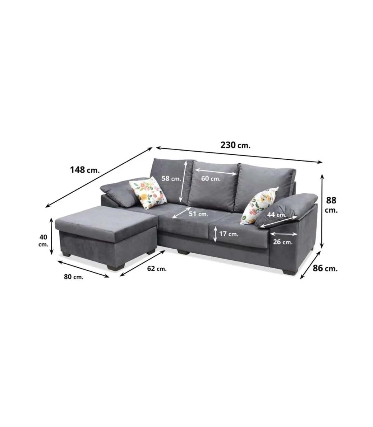 Este modelo consiste em um sofá com 3 assentos com uma medida total de 230 cm de largura x 86 cm de profundidade e de 80 cm de largura puff móvel x 62 cm de fundo.